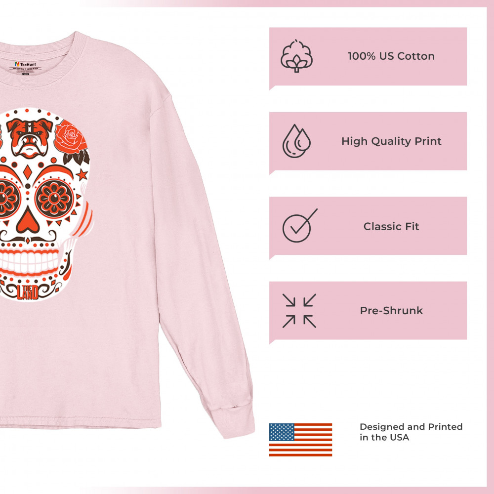 Cleveland Sugar Skull with Lake Erie pride, Rust Belt football grit, orange & brown tradition, playoff vibes, and Game Day passion.