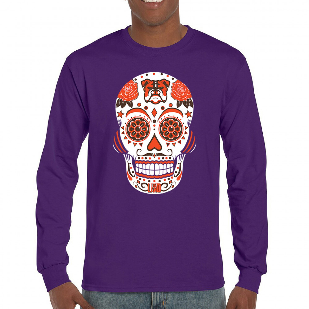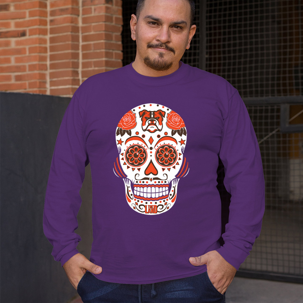 Cleveland Sugar Skull with Lake Erie pride, Rust Belt football grit, orange & brown tradition, playoff vibes, and Game Day passion.