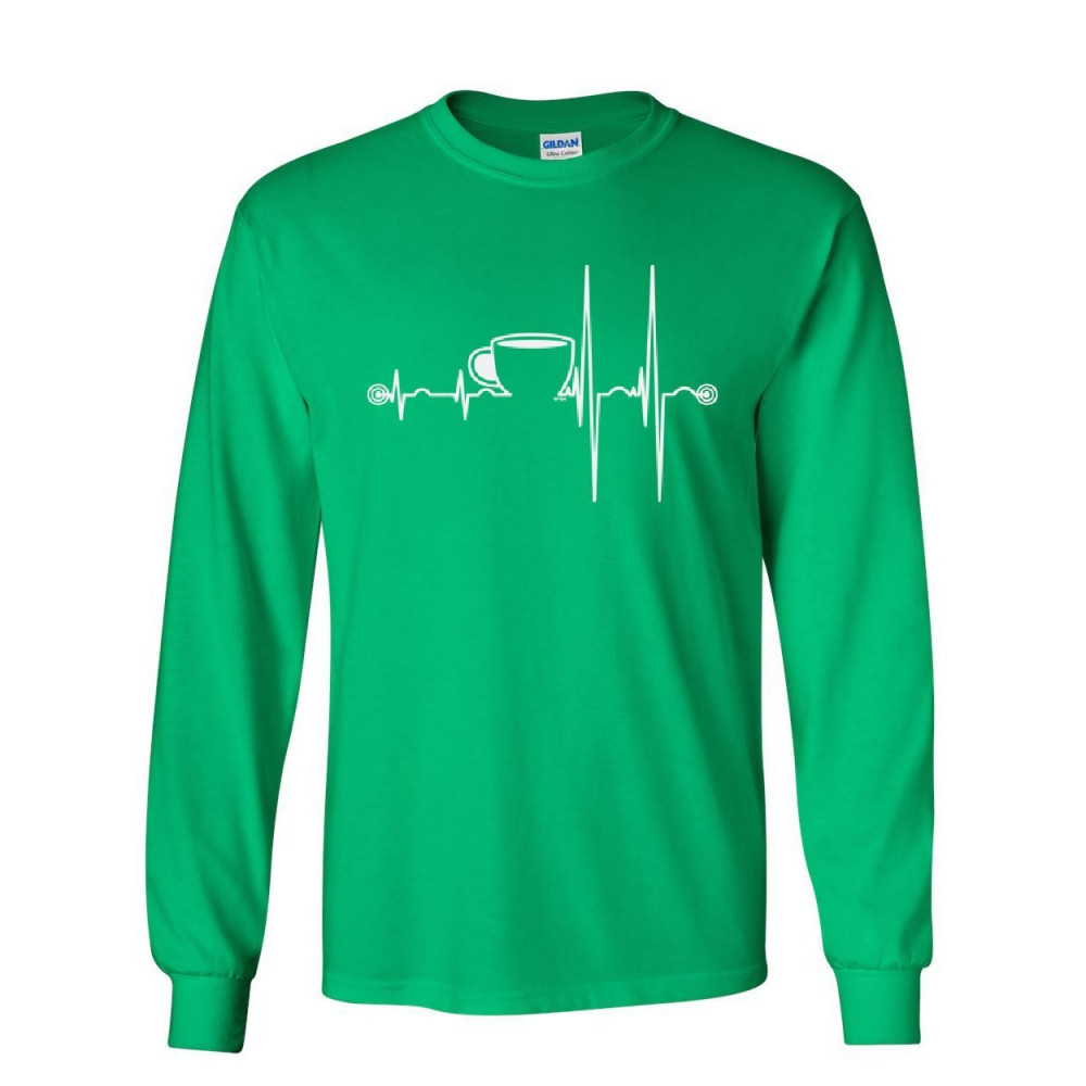 COFFEE CUP HEARTBEAT long sleeve t-shirt energy waking up coffee drinker tee green