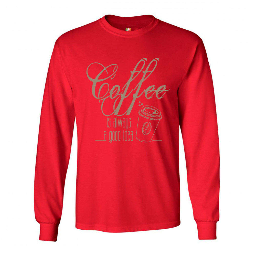 A print saying "Coffee is always a good idea". The print features a picture of a paper cup of tea with a coffee bean on it and with several hearts steaming from it. A great choice to wear to spread positive vibes and show what a passionate coffee fan you