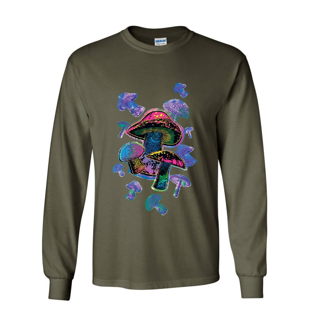 NEON MUSHROOMS colorful long sleeve t-shirt shrooms psychedelic psilocybin tee military green