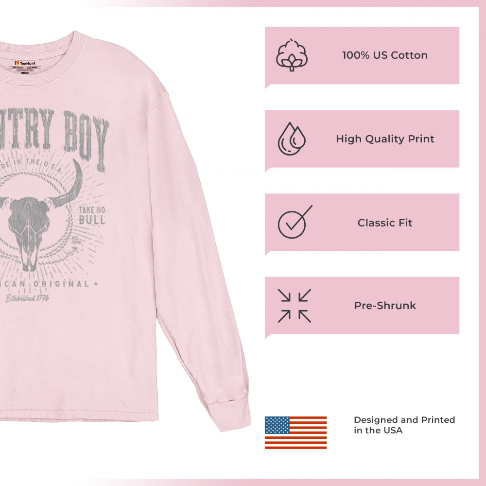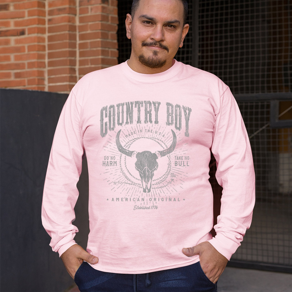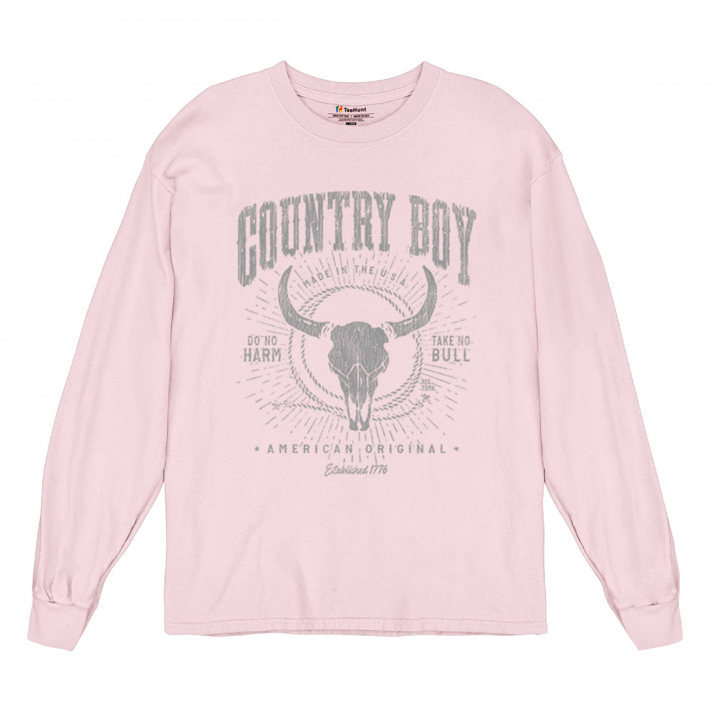 Bold country boy design with bull skull, distressed western style, patriotic grit, and the phrase “Do No Harm, Take No Bull.â€
