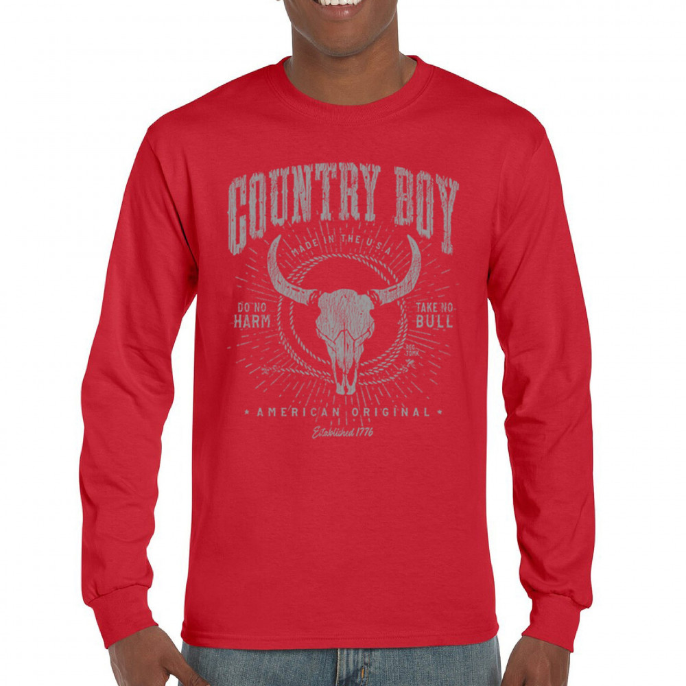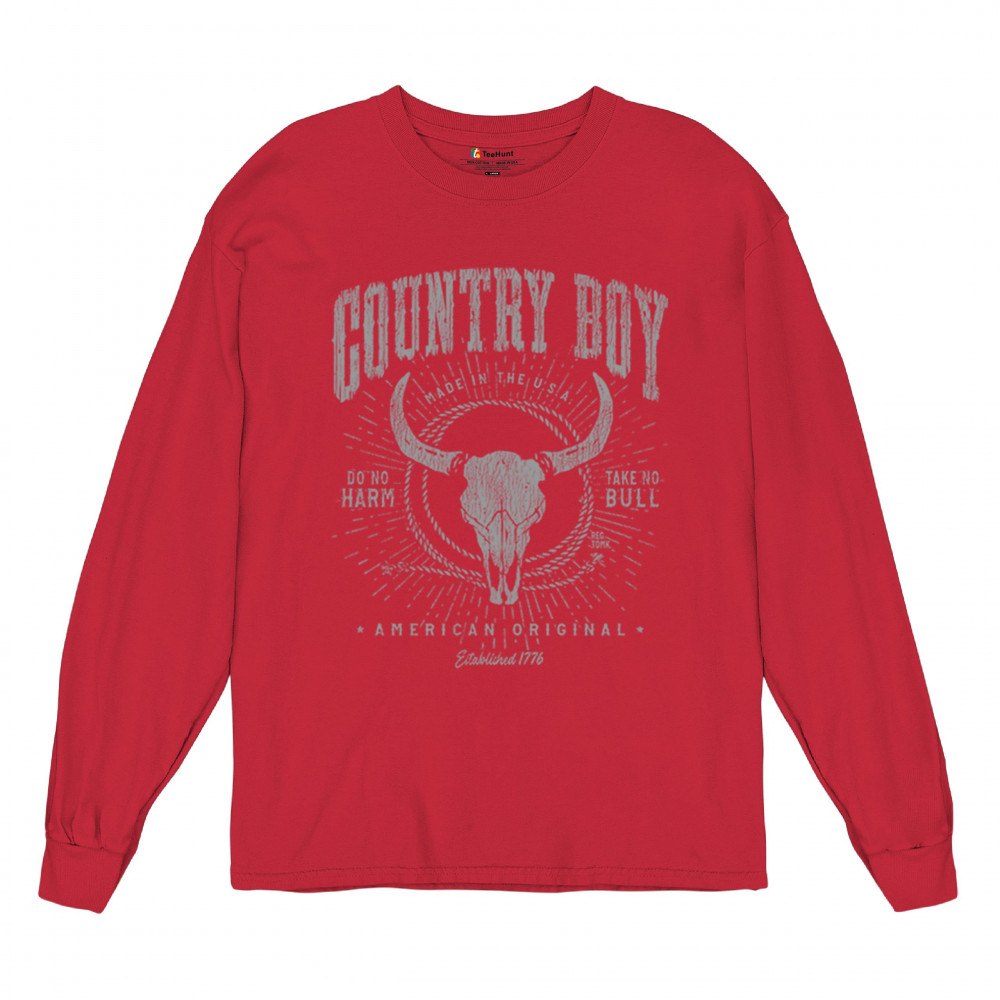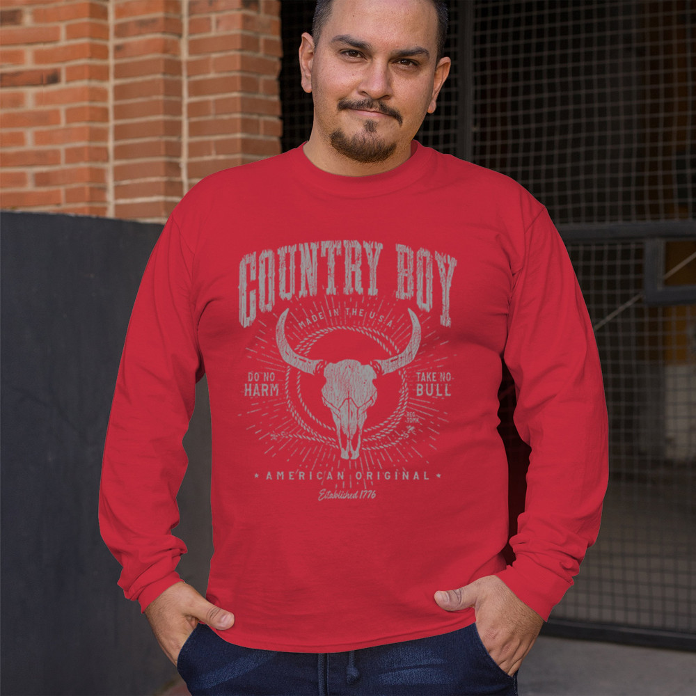 Bold country boy design with bull skull, distressed western style, patriotic grit, and the phrase “Do No Harm, Take No Bull.â€