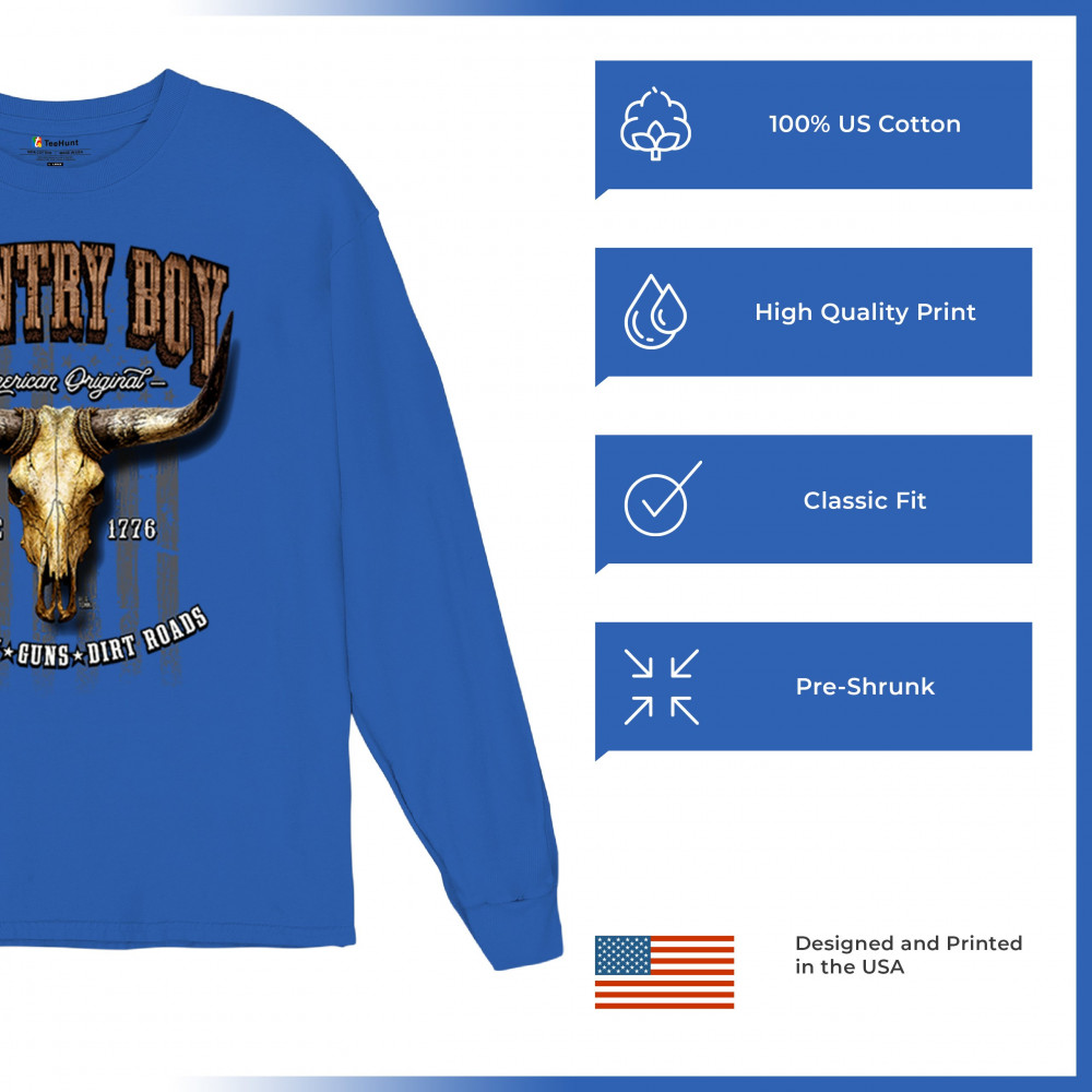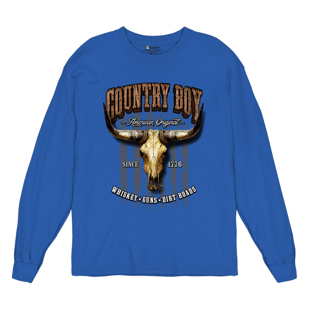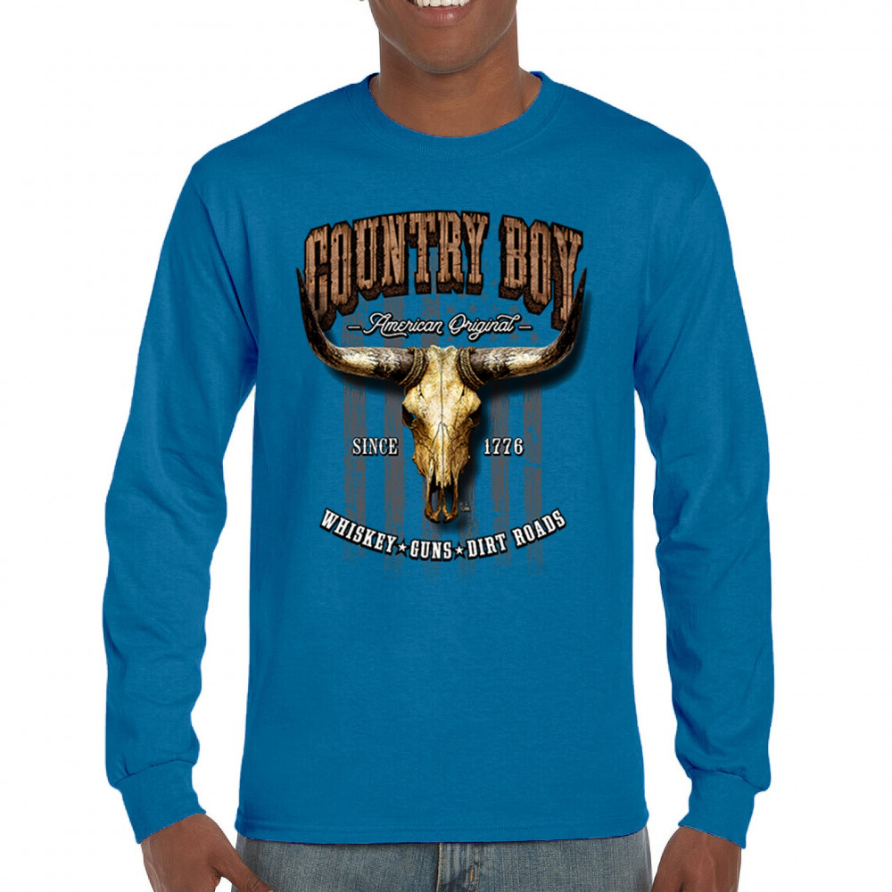 Country Boy – American Original. This bold western design captures the essence of southern living with a vintage bull skull, rustic lettering, and pride in whiskey, guns, and dirt roads. From 1776 to today, it honors the heritage of freedom-loving country men. Wear it to rodeos, bonfires, or muddy trails.