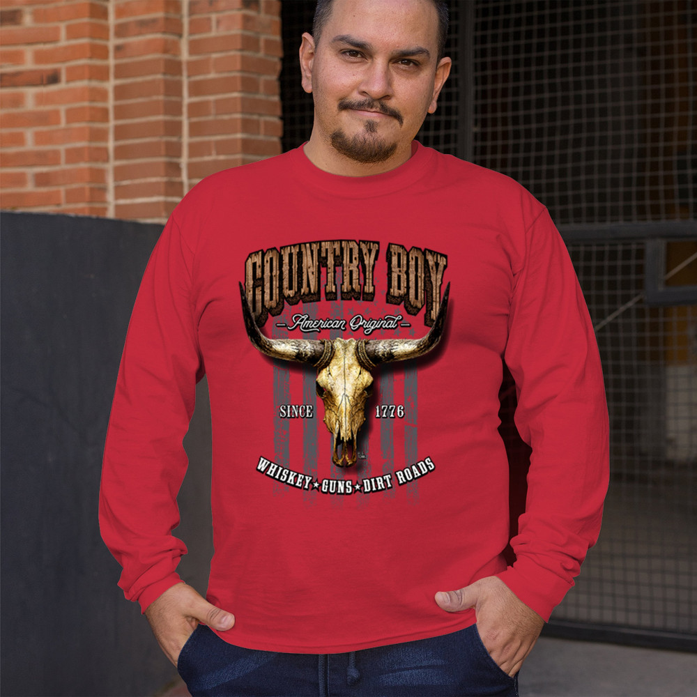 Country Boy – American Original. This bold western design captures the essence of southern living with a vintage bull skull, rustic lettering, and pride in whiskey, guns, and dirt roads. From 1776 to today, it honors the heritage of freedom-loving country men. Wear it to rodeos, bonfires, or muddy trails.