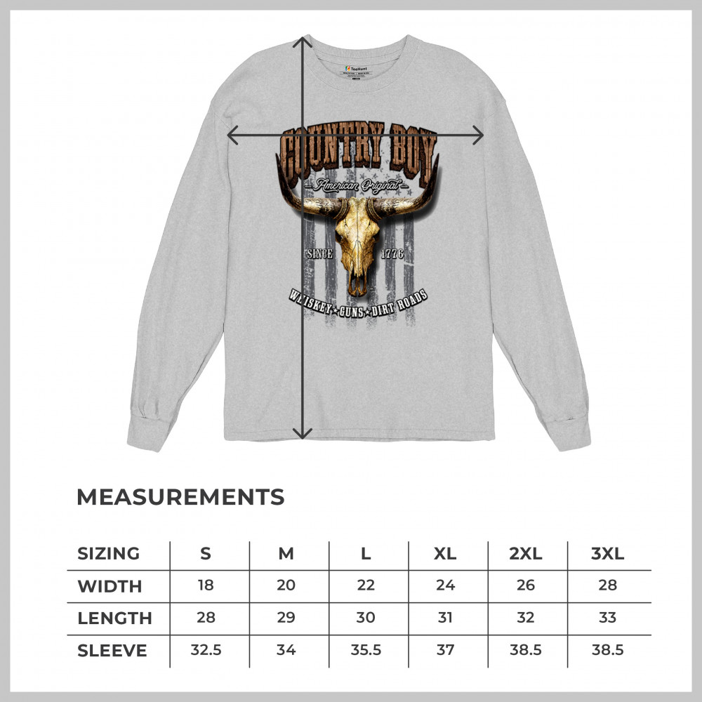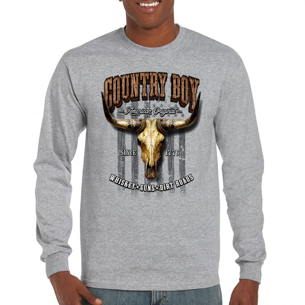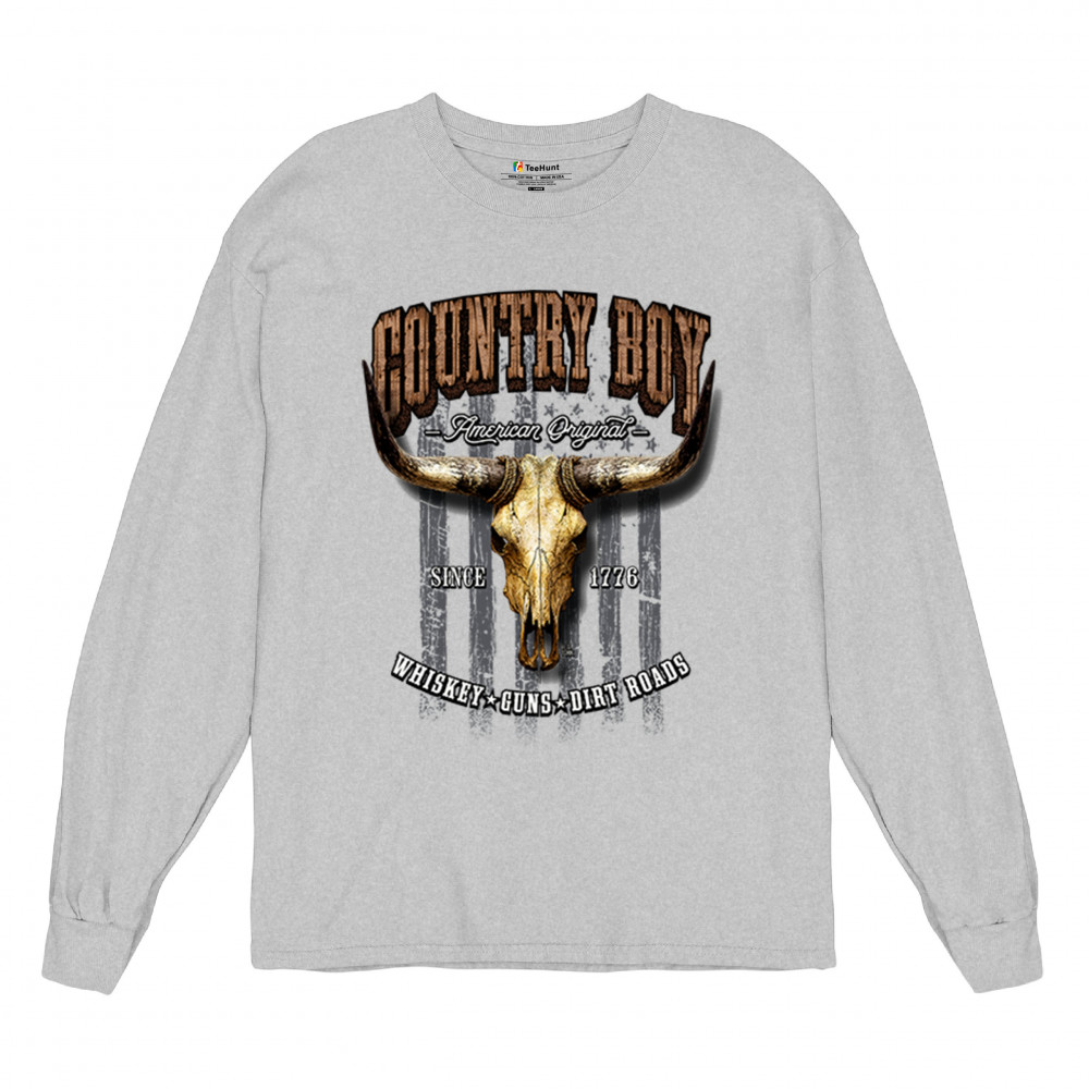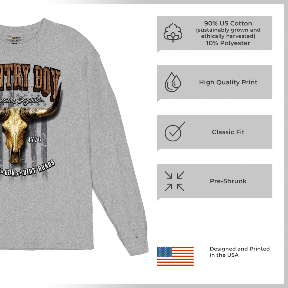Country Boy – American Original. This bold western design captures the essence of southern living with a vintage bull skull, rustic lettering, and pride in whiskey, guns, and dirt roads. From 1776 to today, it honors the heritage of freedom-loving country men. Wear it to rodeos, bonfires, or muddy trails.