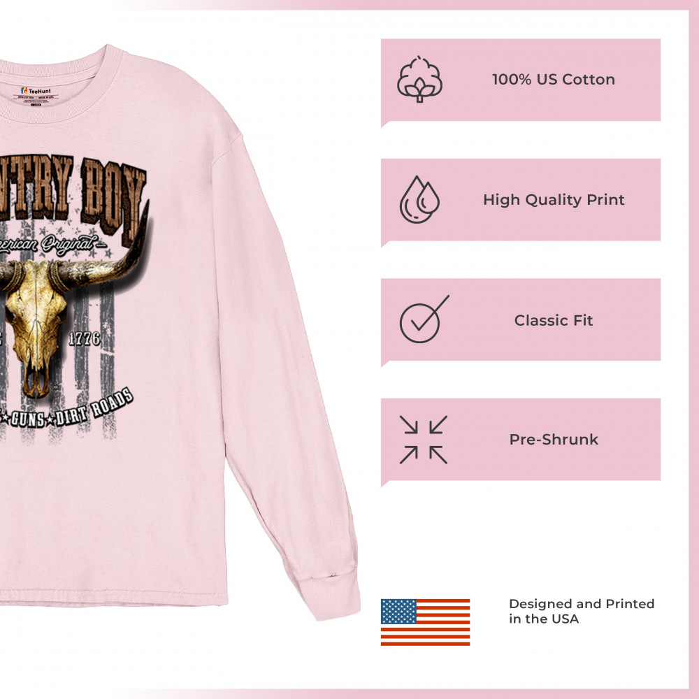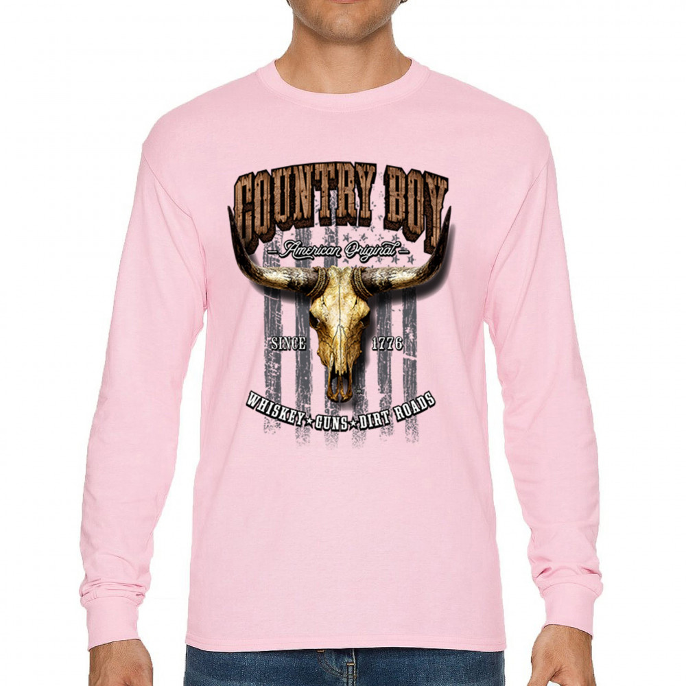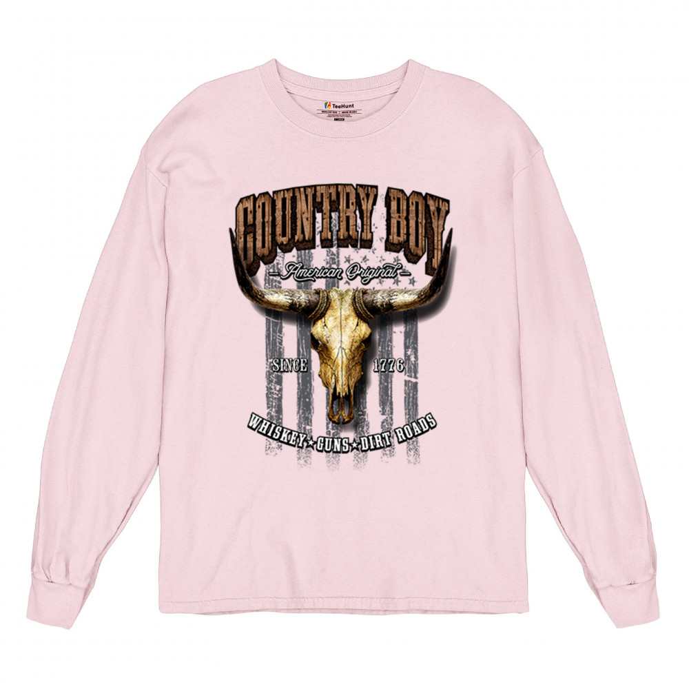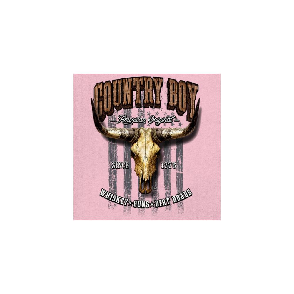 Country Boy – American Original. This bold western design captures the essence of southern living with a vintage bull skull, rustic lettering, and pride in whiskey, guns, and dirt roads. From 1776 to today, it honors the heritage of freedom-loving country men. Wear it to rodeos, bonfires, or muddy trails.