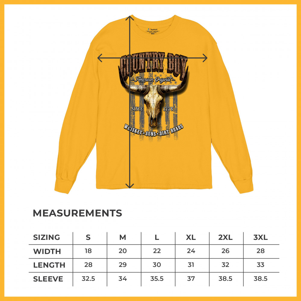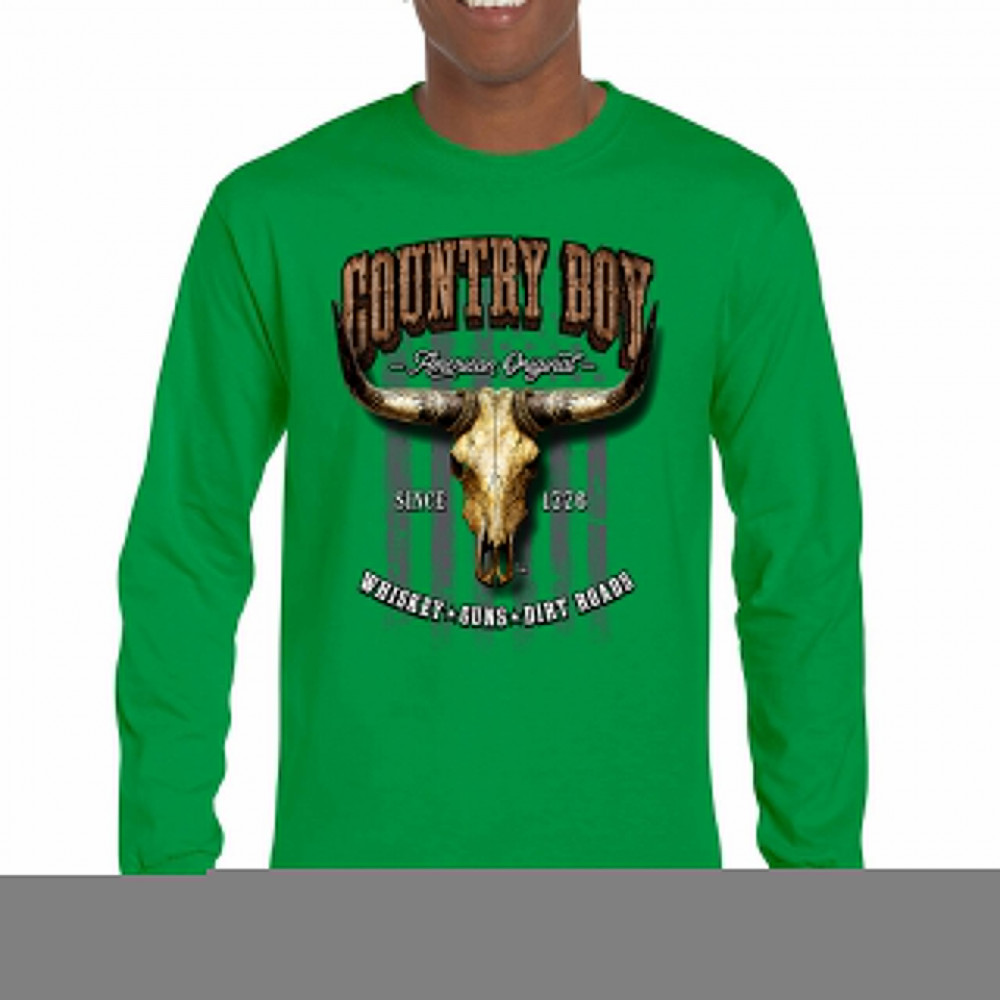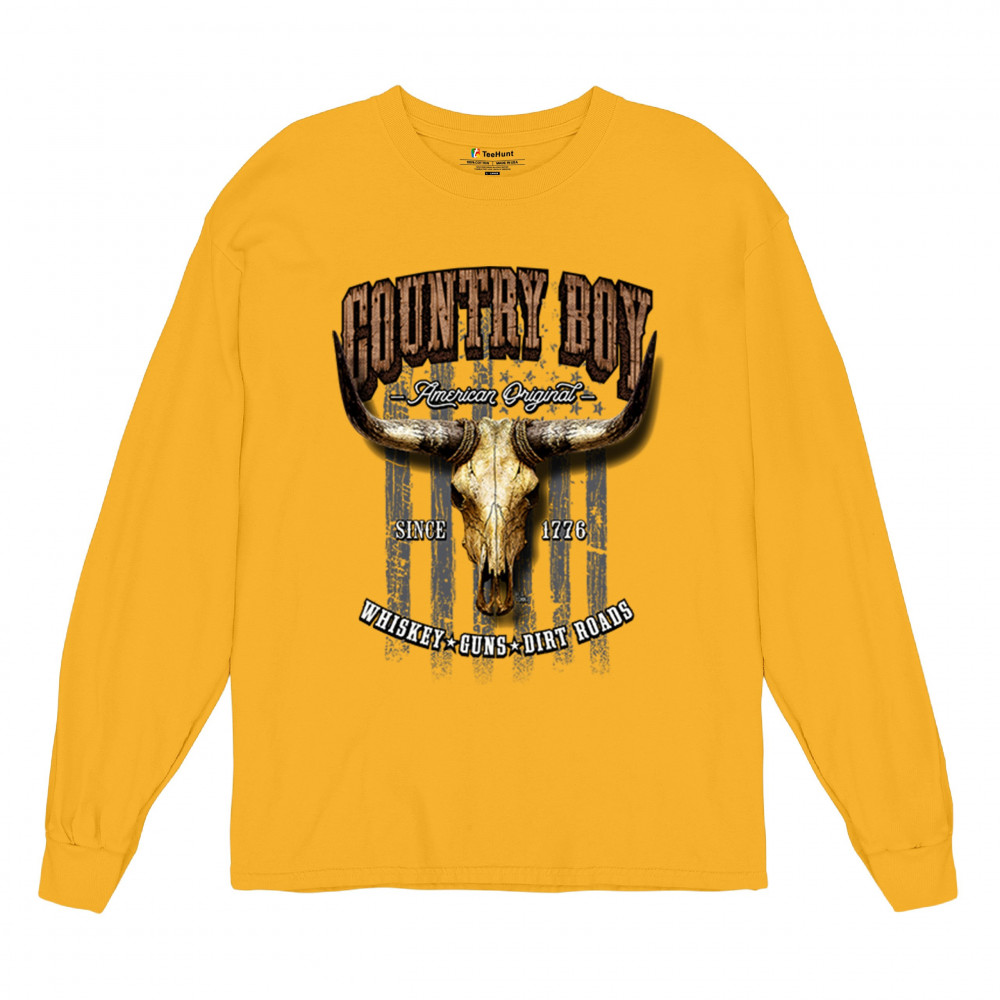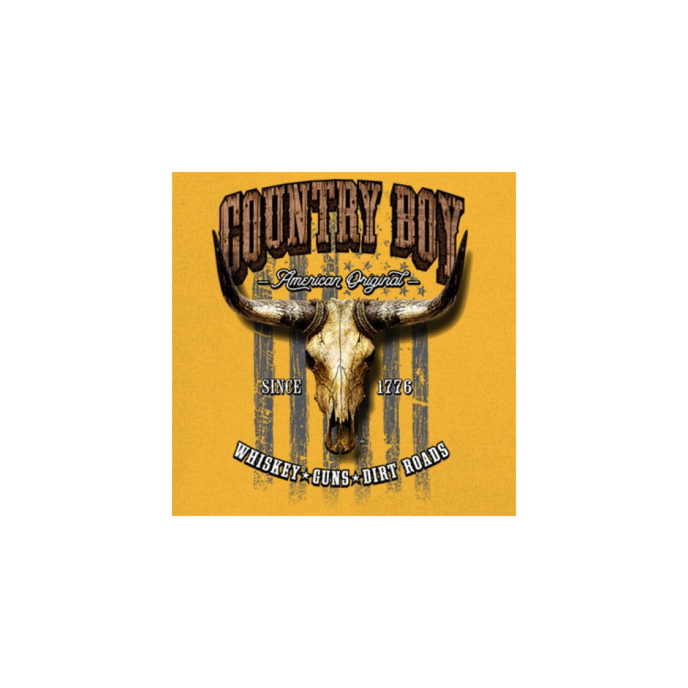 Country Boy – American Original. This bold western design captures the essence of southern living with a vintage bull skull, rustic lettering, and pride in whiskey, guns, and dirt roads. From 1776 to today, it honors the heritage of freedom-loving country men. Wear it to rodeos, bonfires, or muddy trails.