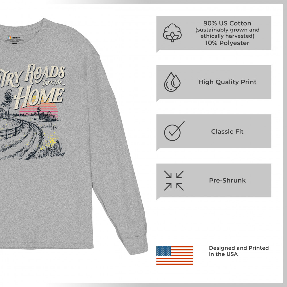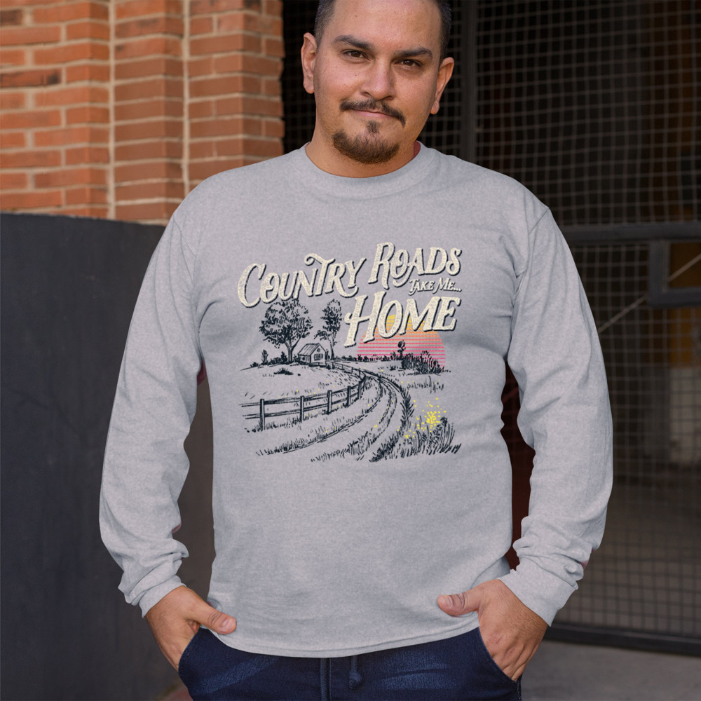 Celebrate your love for small town charm and scenic drives with this nostalgic country roads design. Featuring a bold "Take Me Home" message over a retro-styled sunset, it’s ideal for road trips, summer nights, fairs, concerts, and rural adventures. Let your wanderlust and country soul shine in every mile.