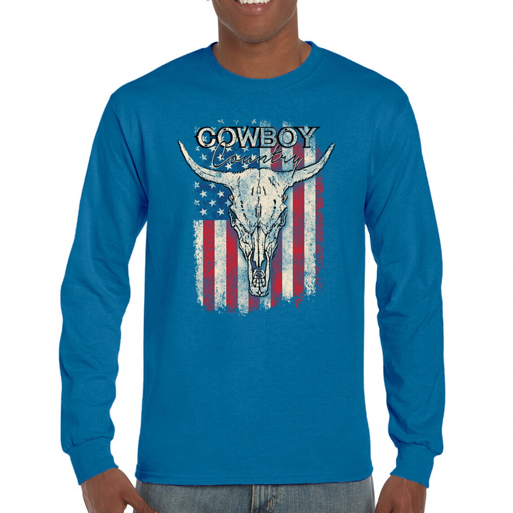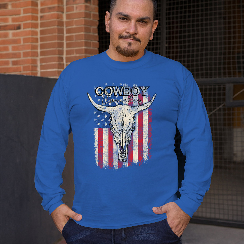 Cowboy Country steer skull design fuses rustic Americana, rodeo style, western heritage, and desert vibes for true frontier spirit.