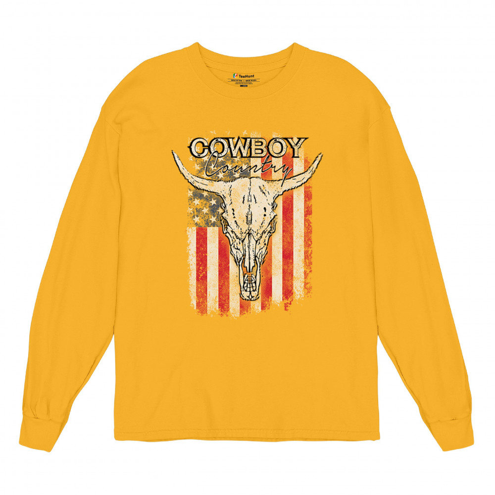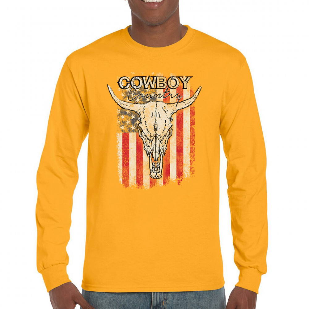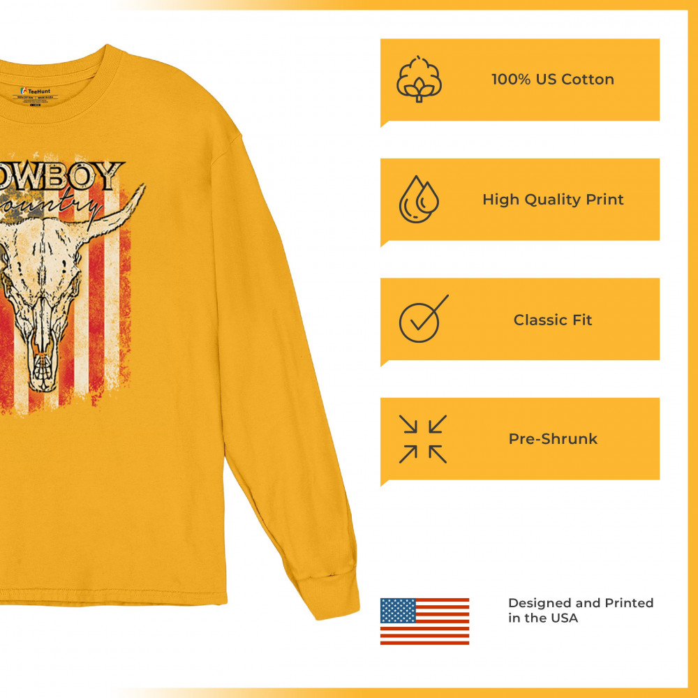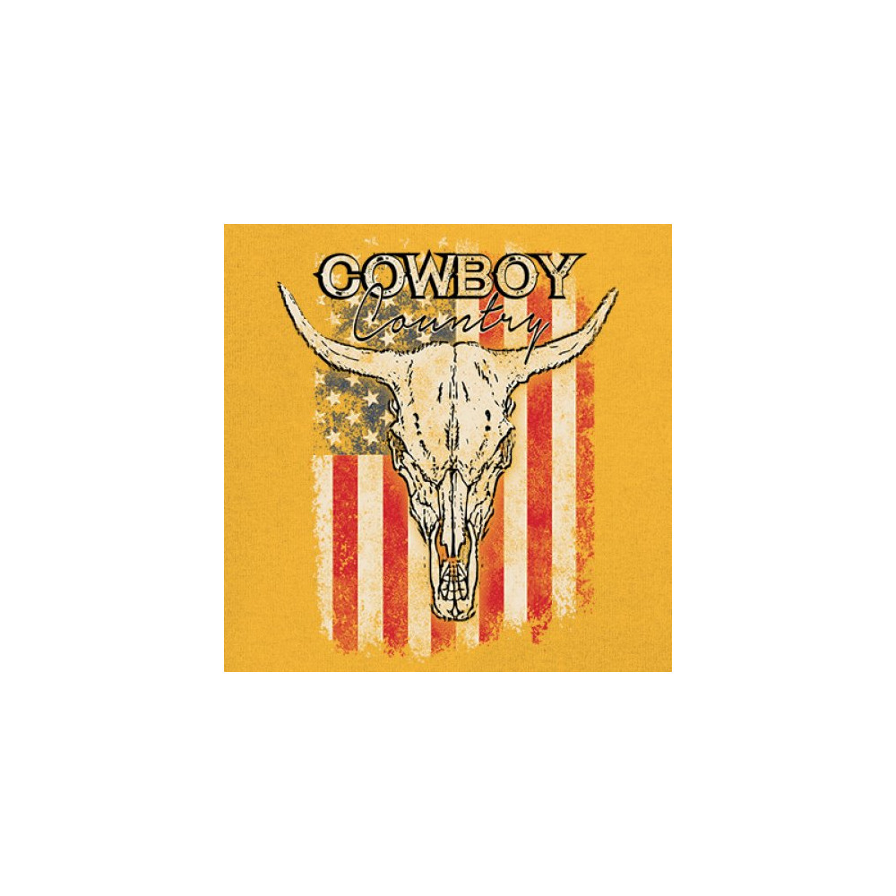 Cowboy Country steer skull design fuses rustic Americana, rodeo style, western heritage, and desert vibes for true frontier spirit.