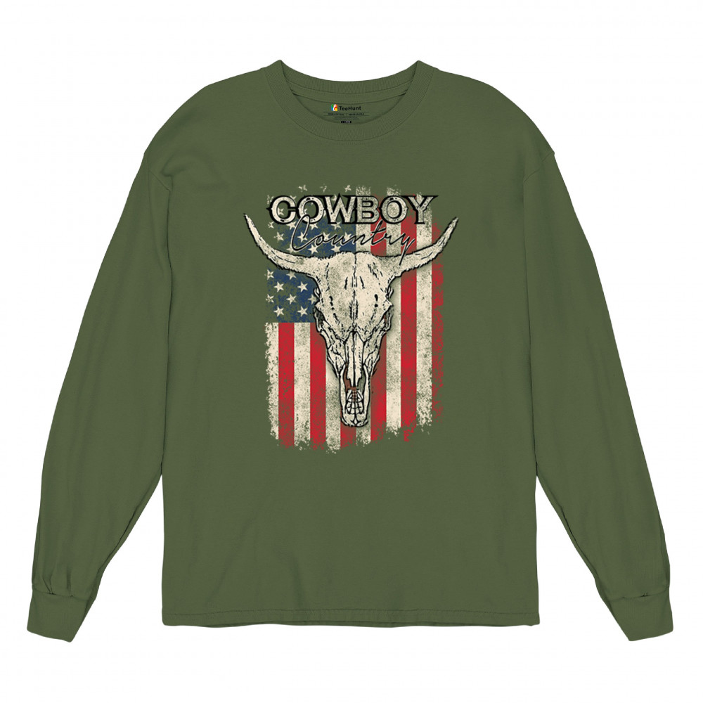 Celebrate western heritage with the Cowboy Country steer skull design, layered over a distressed American flag. This artwork embodies rustic Americana, rodeo style, and desert vibes. Perfect for cowboy décor lovers, ranch life enthusiasts, and those drawn to the wild west’s grit and prairie aesthetic. Wear your frontier spirit proudly.
