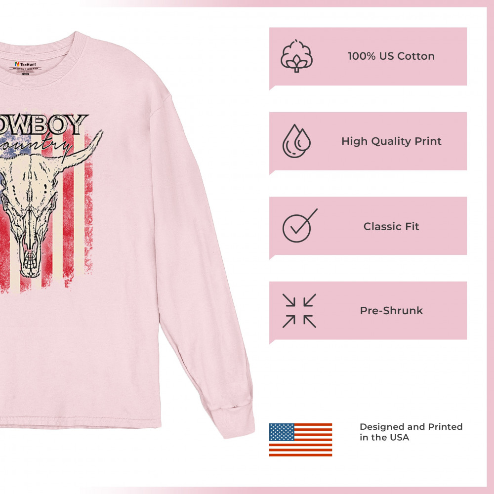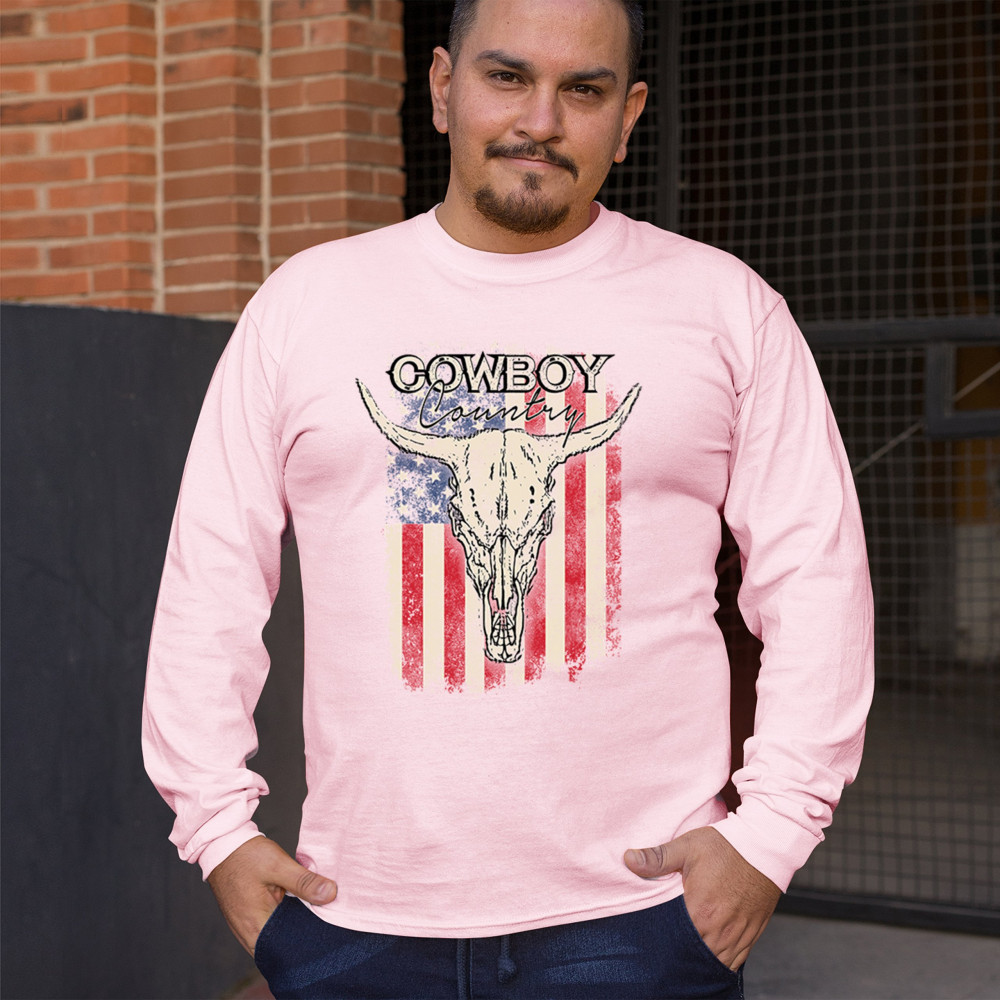 Cowboy Country steer skull design fuses rustic Americana, rodeo style, western heritage, and desert vibes for true frontier spirit.