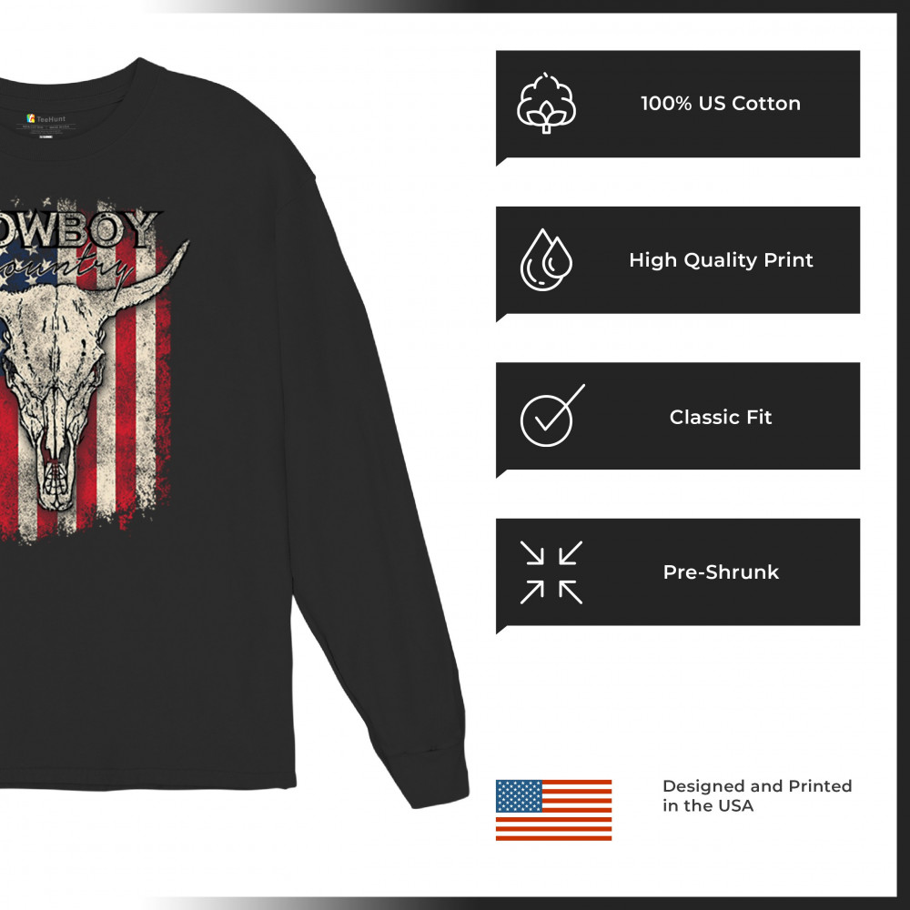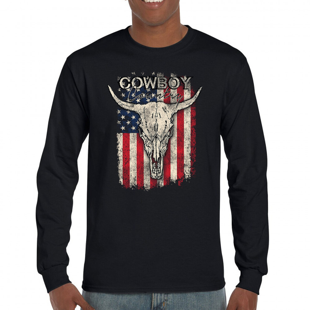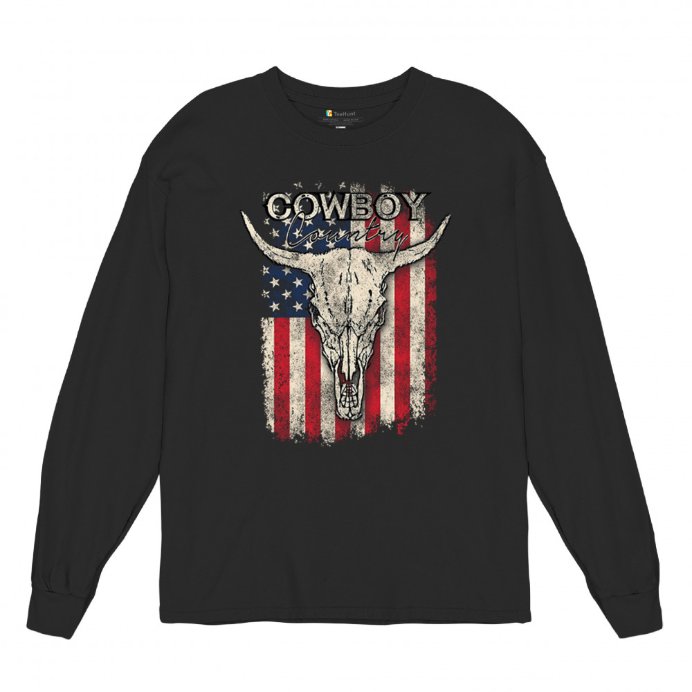 Celebrate western heritage with the Cowboy Country steer skull design, layered over a distressed American flag. This artwork embodies rustic Americana, rodeo style, and desert vibes. Perfect for cowboy décor lovers, ranch life enthusiasts, and those drawn to the wild west’s grit and prairie aesthetic. Wear your frontier spirit proudly.