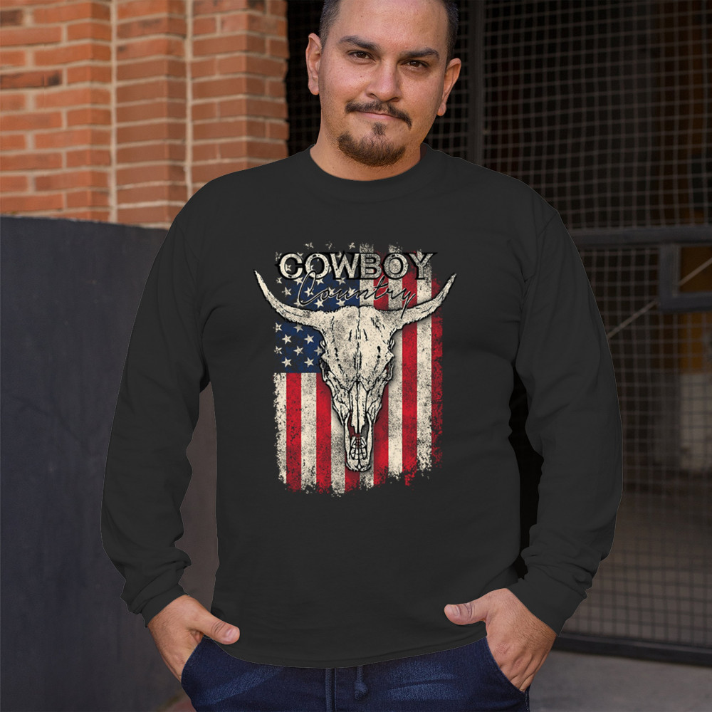 Cowboy Country steer skull design fuses rustic Americana, rodeo style, western heritage, and desert vibes for true frontier spirit.