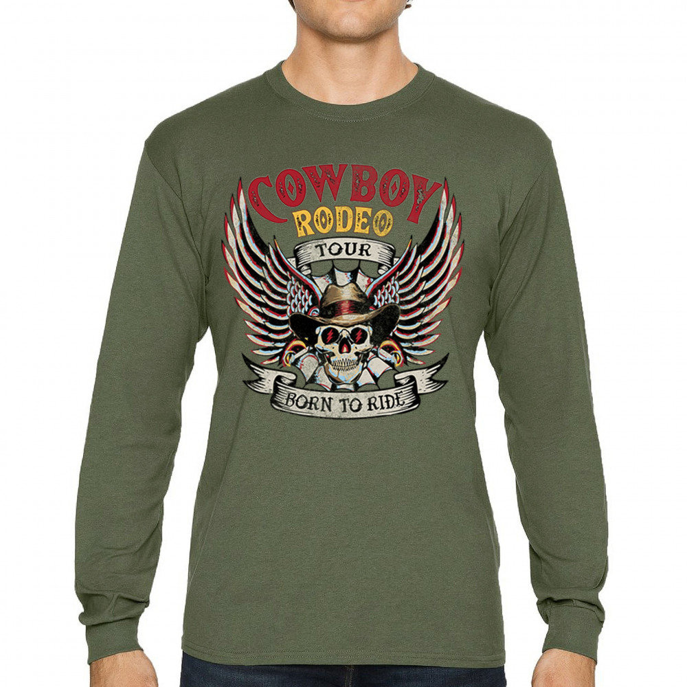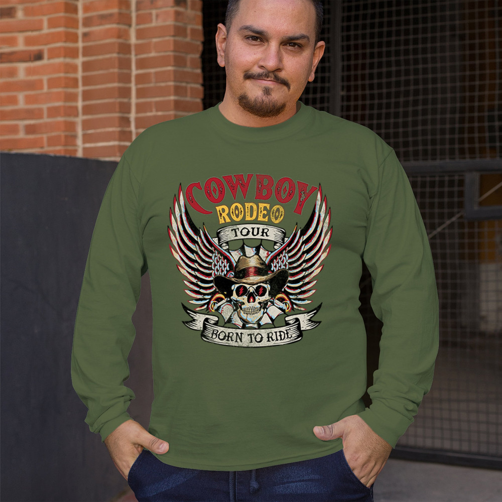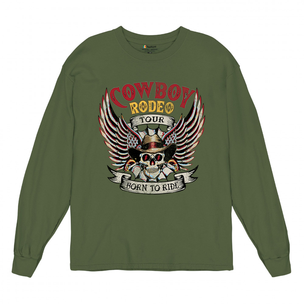 Cowboy Rodeo Tour “Born to Ride†design with skull, wings, and western grit. Built for riders, rebels, and rodeo fans who live wild.