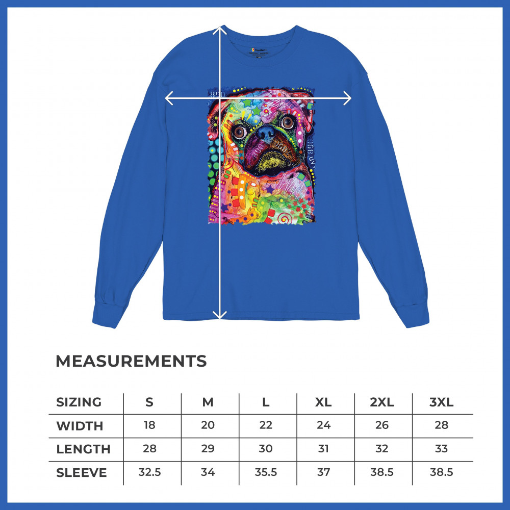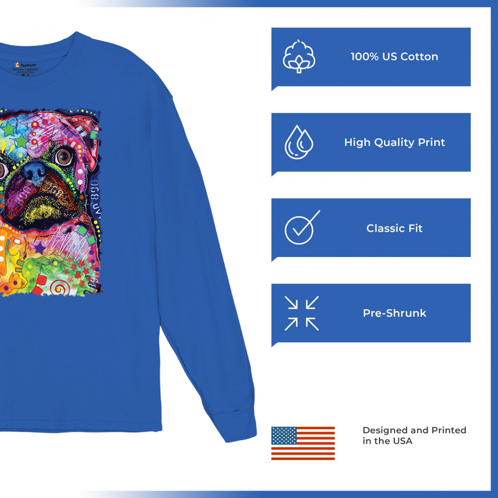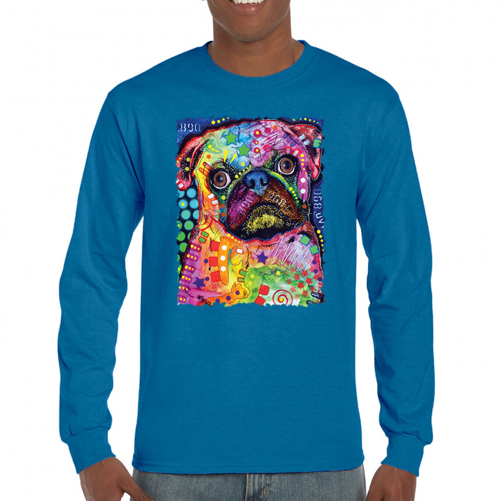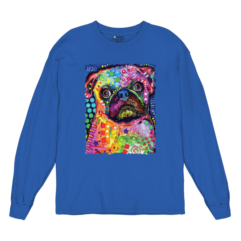 CUTE PUG PUPPY long sleeve t-shirt dean russo colorful neon mosaic dog art royal blue