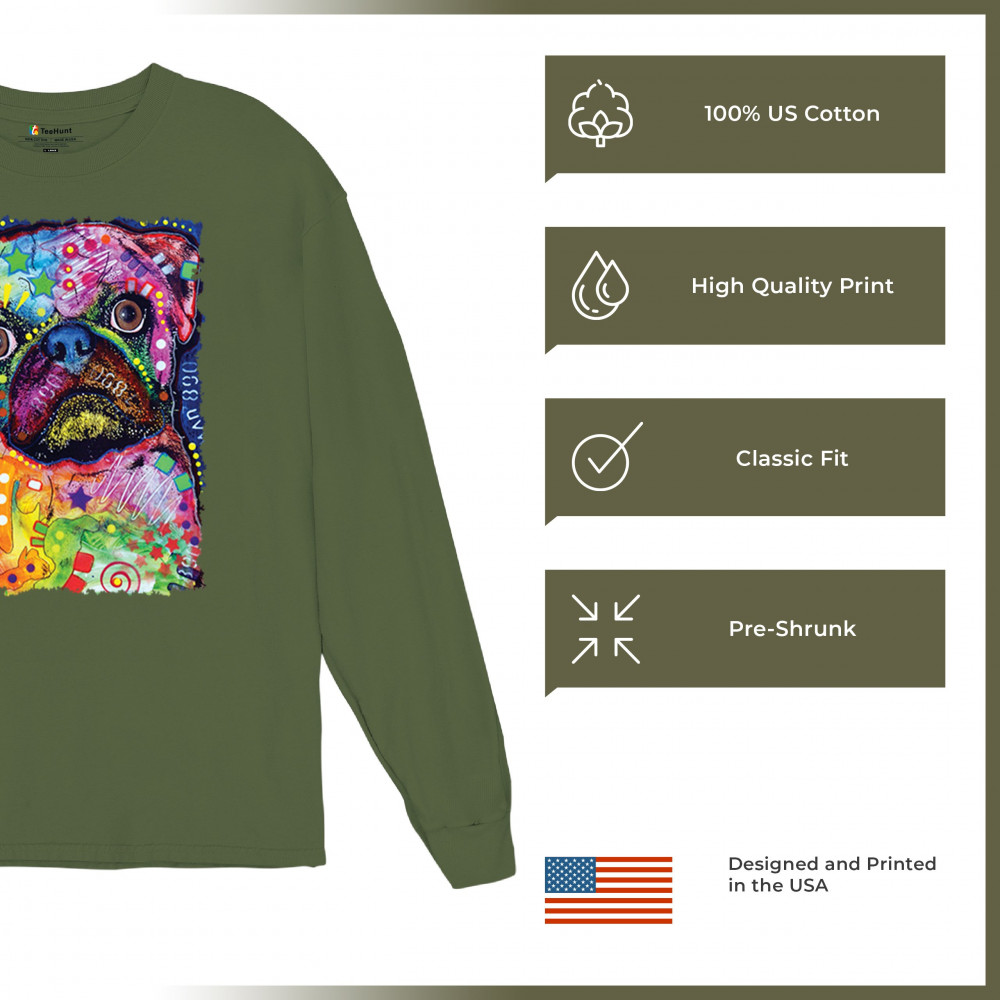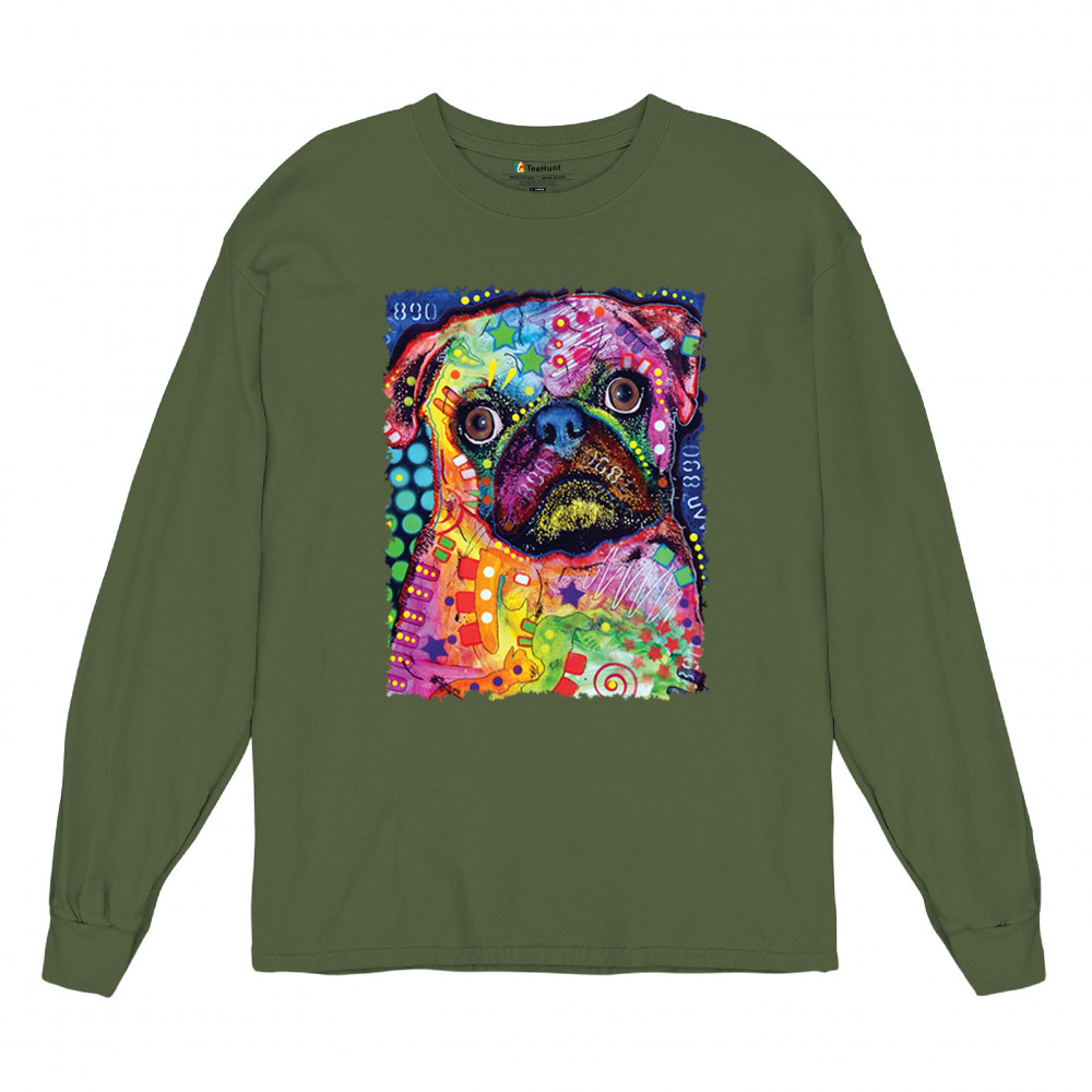 CUTE PUG PUPPY long sleeve t-shirt dean russo colorful neon mosaic dog art military green