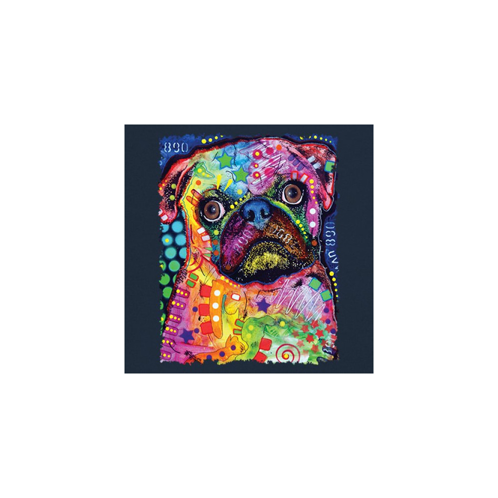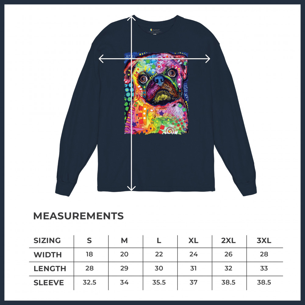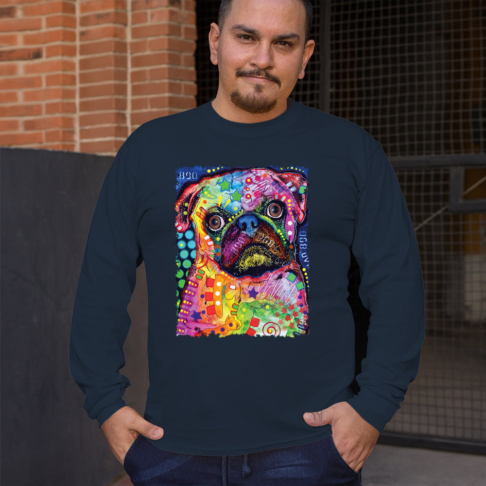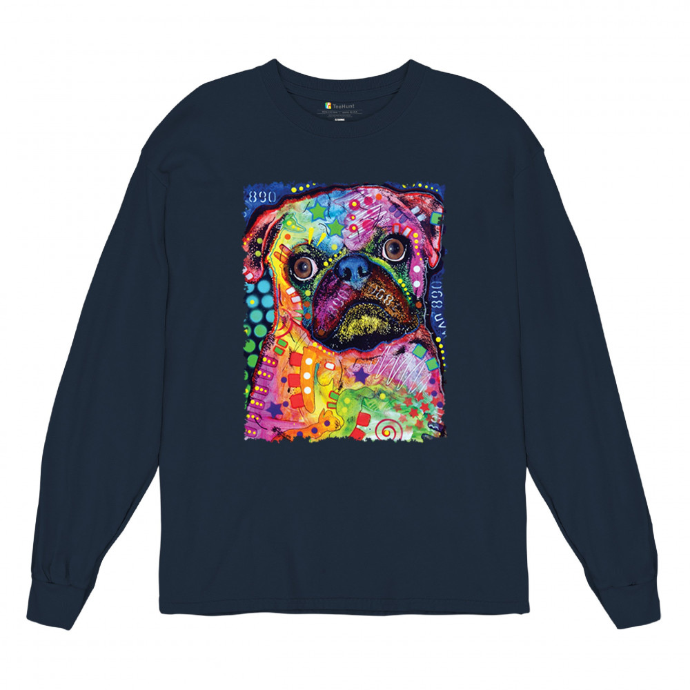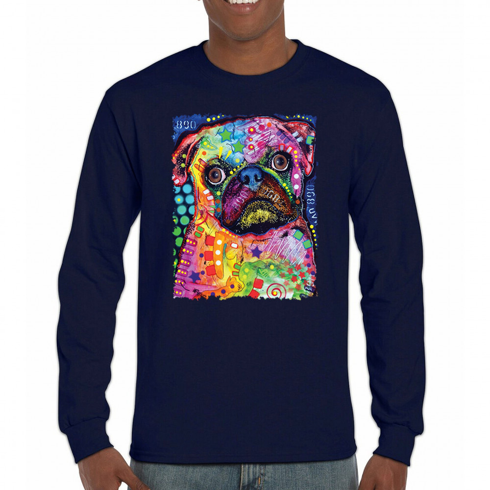 CUTE PUG PUPPY long sleeve t-shirt dean russo colorful neon mosaic dog art navy blue