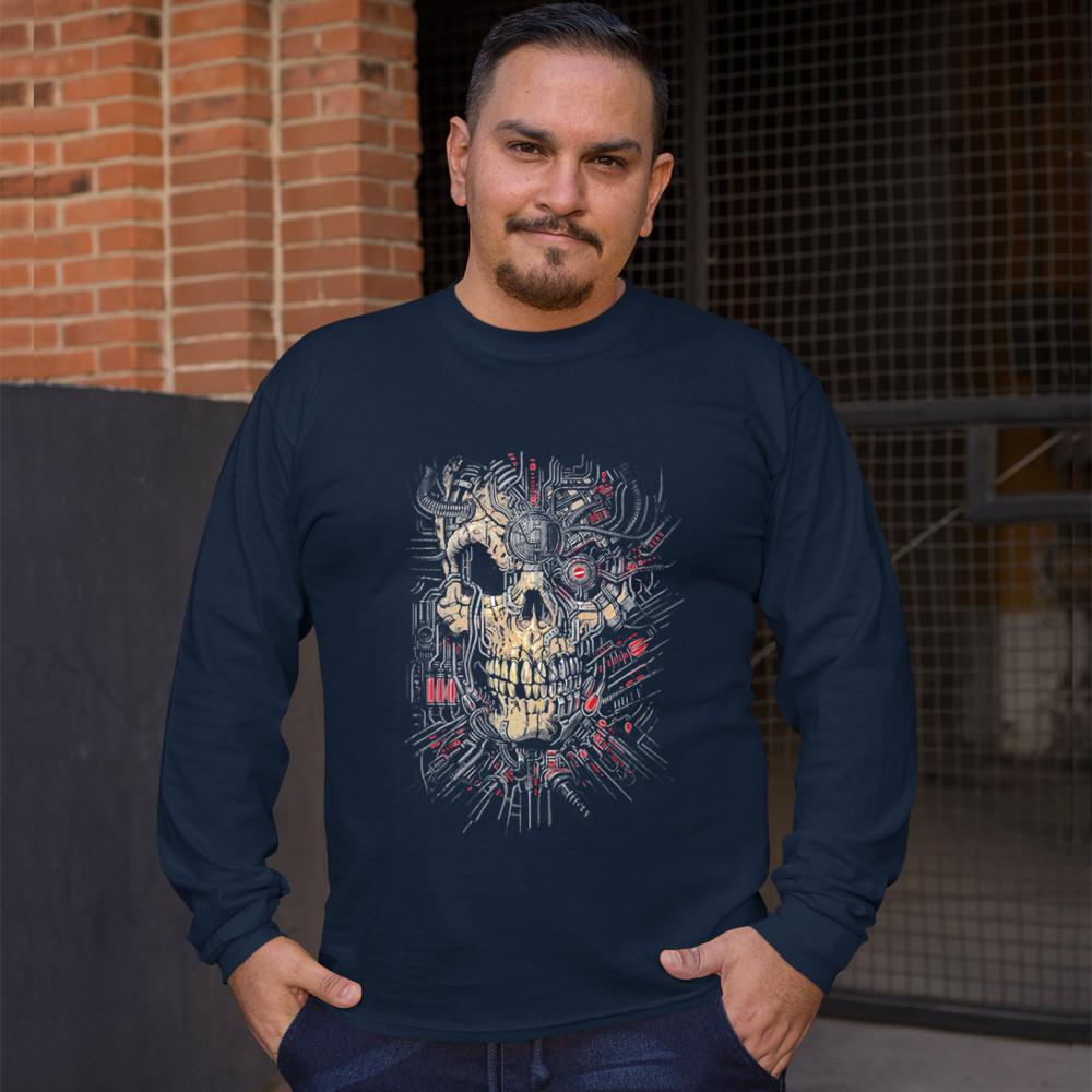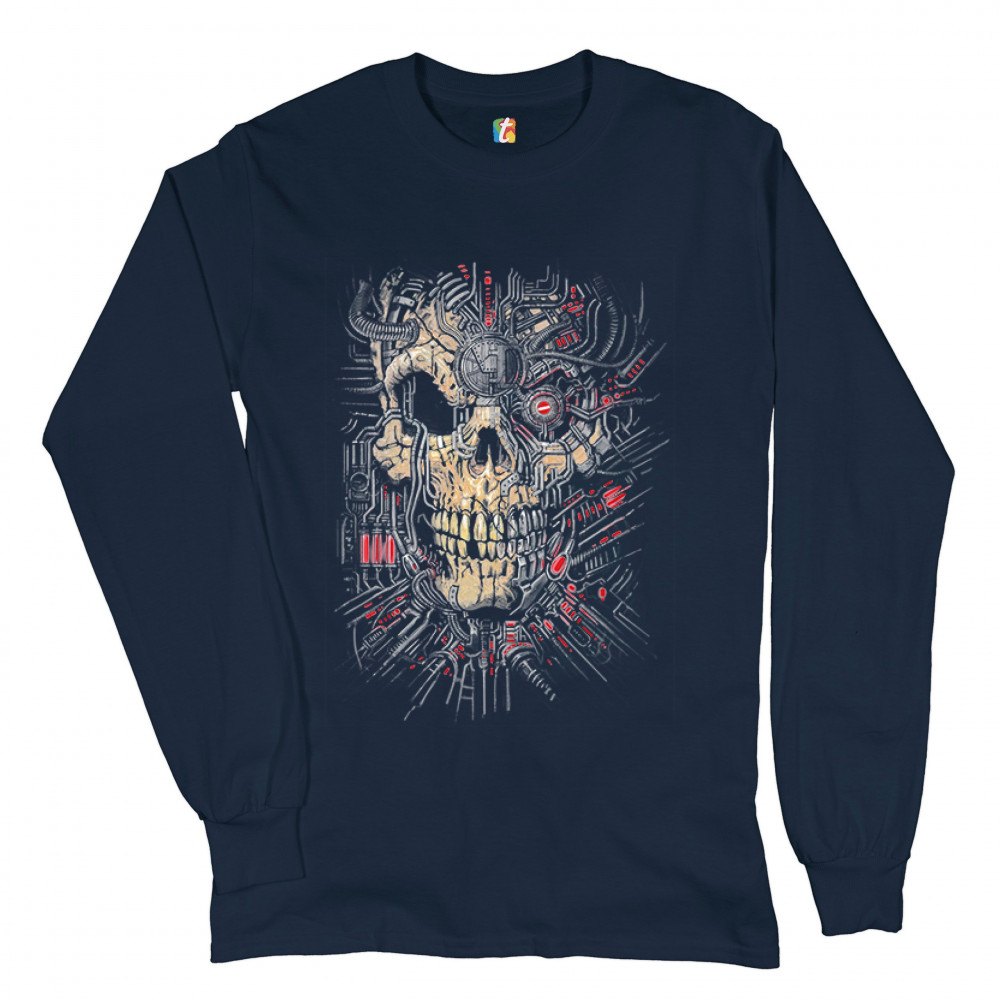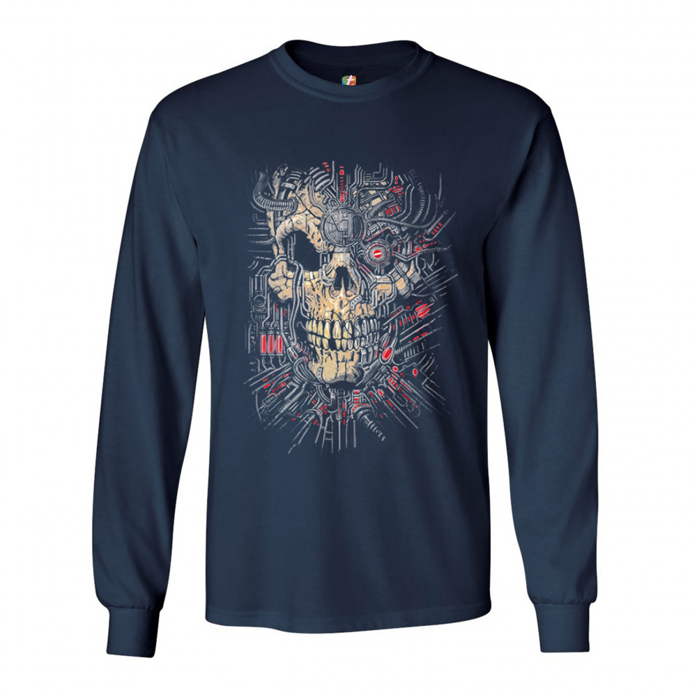 CYBORG SKULL FACE long sleeve t-shirt scary cyberpunk robot horror navy blue