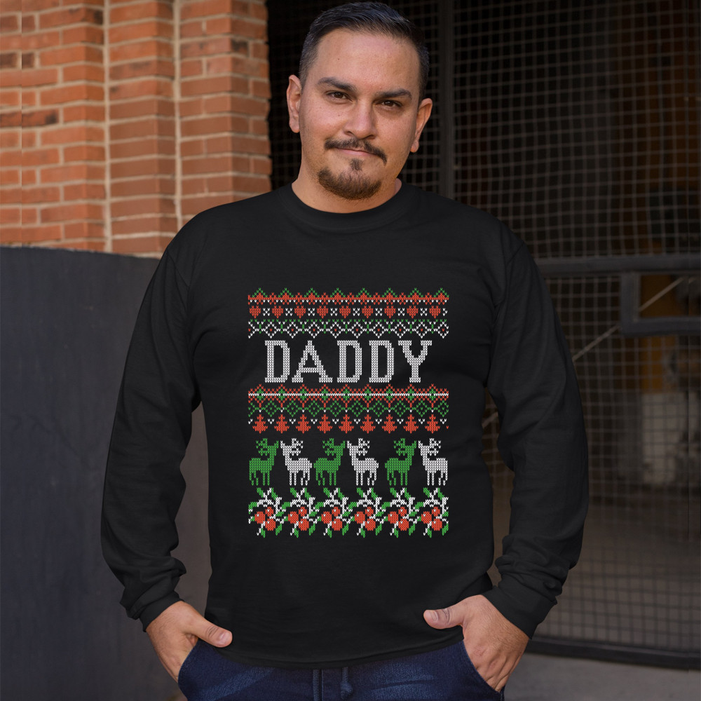 A print saying: "Daddy" and featuring six reindeers. The print is designed as an ugly sweater. Amazing choice to make people smile and spread positive vibes on Christmas Eve.