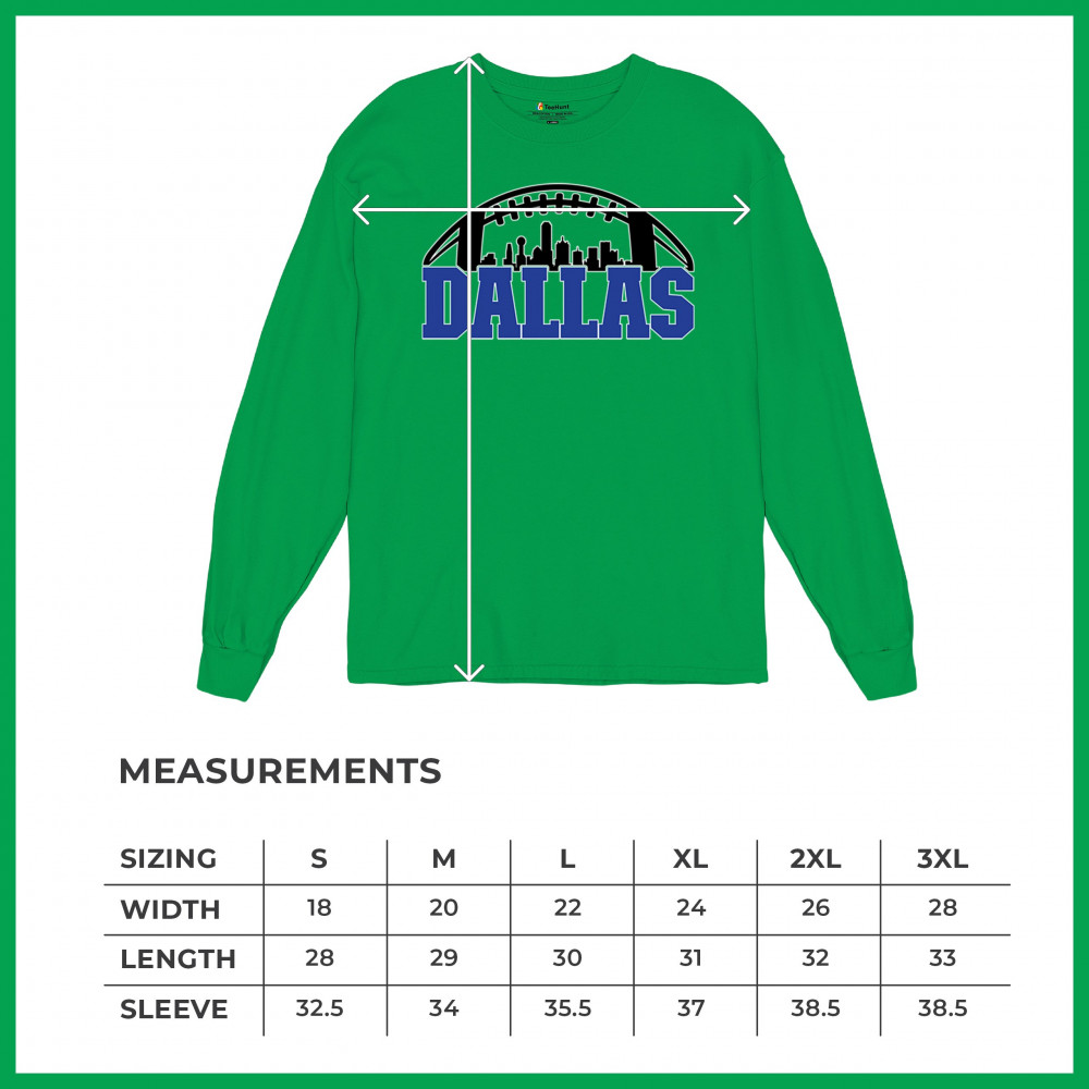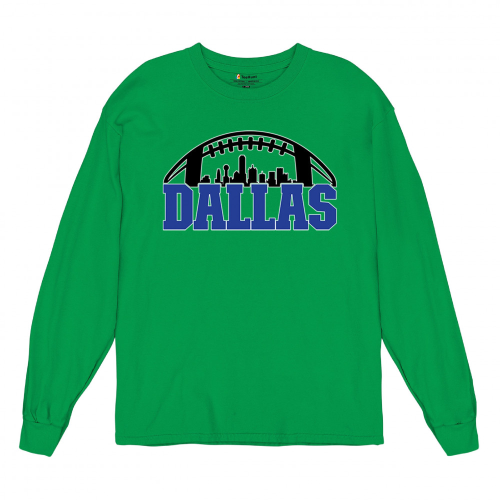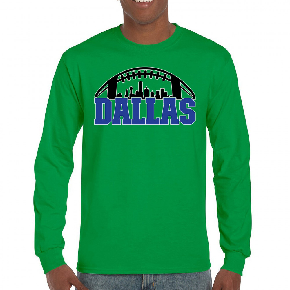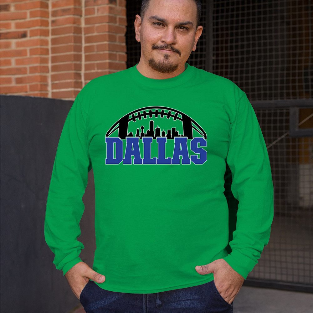 Show off your Dallas pride with a bold football-themed design featuring the city's skyline. Perfect for game days, tailgates, and passionate fans.