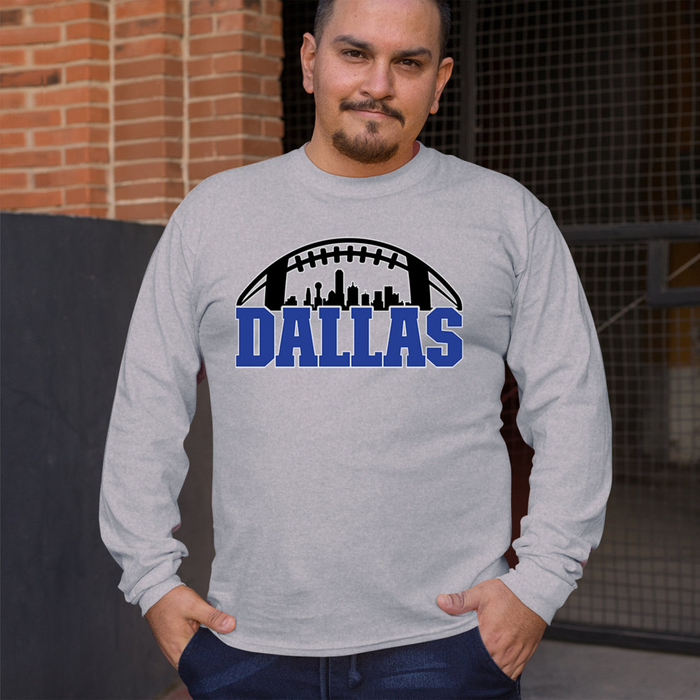 Show off your Dallas pride with a bold football-themed design featuring the city's skyline. Perfect for game days, tailgates, and passionate fans.
