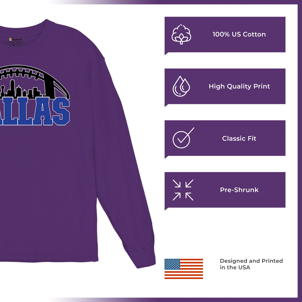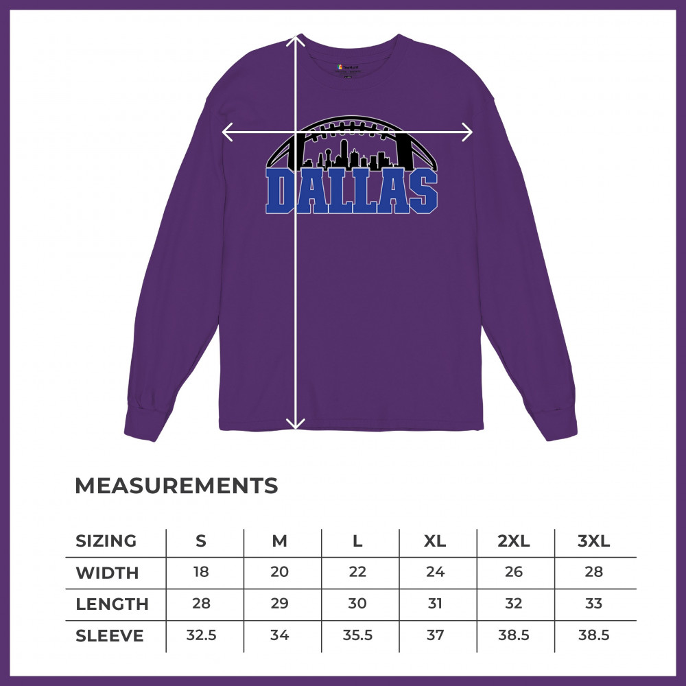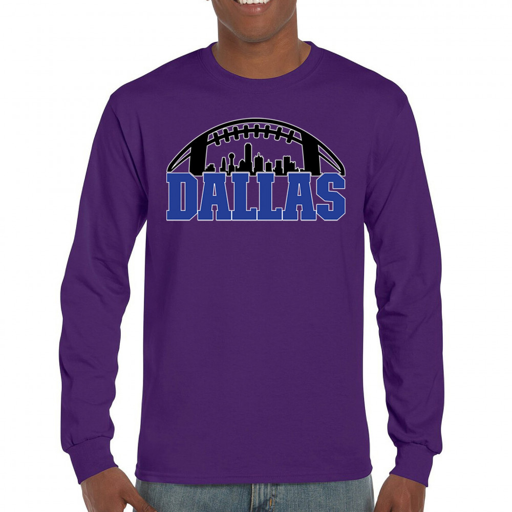 Show off your Dallas pride with a bold football-themed design featuring the city's skyline. Perfect for game days, tailgates, and passionate fans.