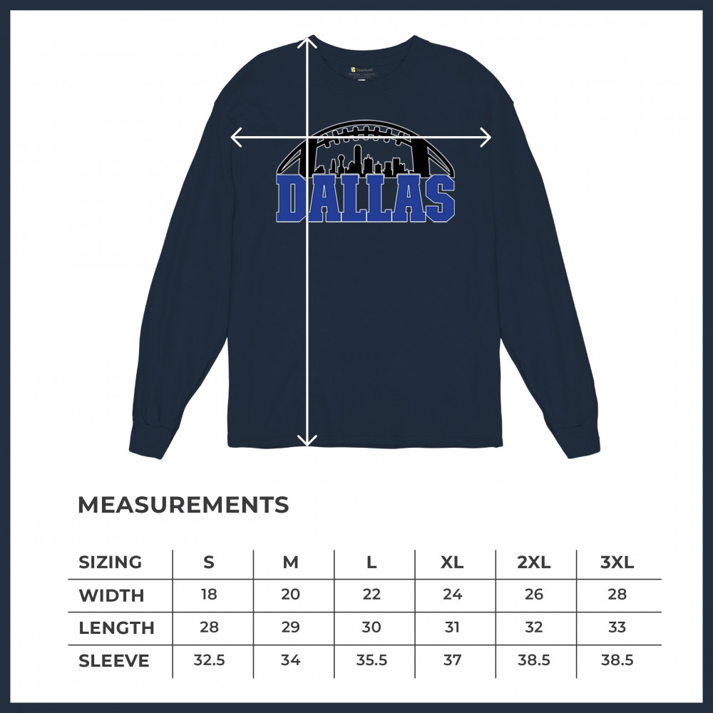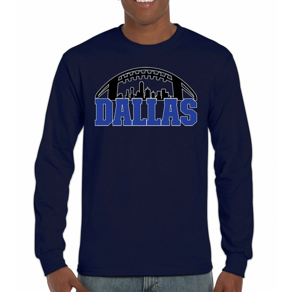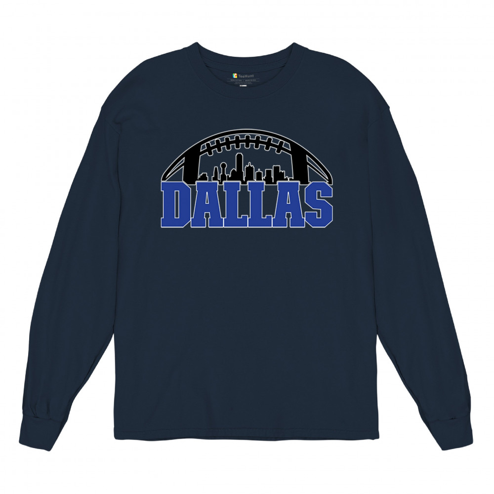 Show off your Dallas pride with a bold football-themed design featuring the city's skyline. Perfect for game days, tailgates, and passionate fans.