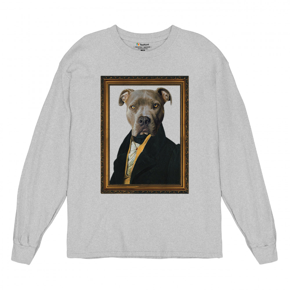 Unique pit bull portrait in 18th-century attire, blending humor and elegance for pet lovers and history enthusiasts. Perfect for home or office decor.