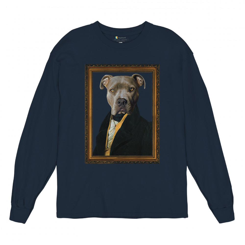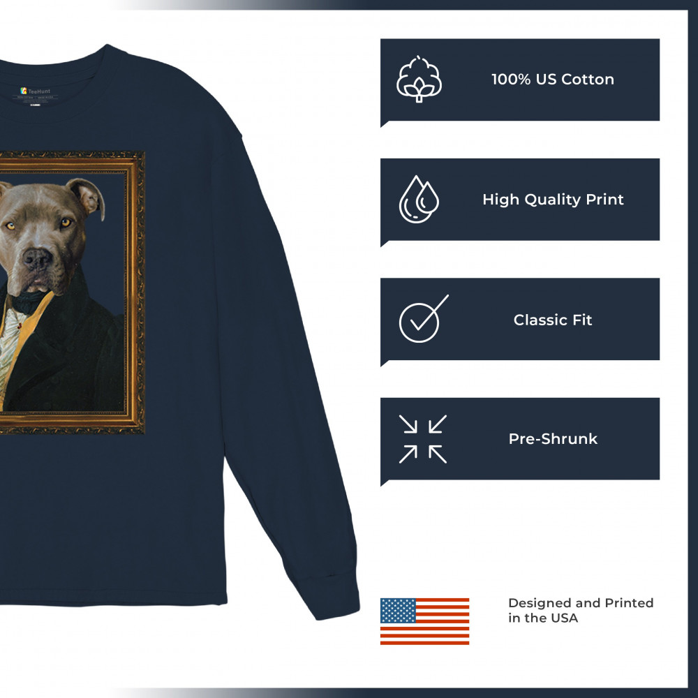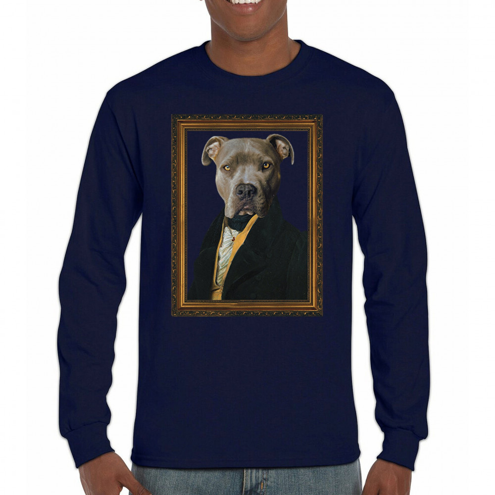 Unique pit bull portrait in 18th-century attire, blending humor and elegance for pet lovers and history enthusiasts. Perfect for home or office decor.