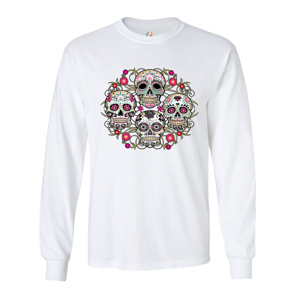 DAY OF THE DEAD FLORAL SUGAR SKULLS long sleeve t-shirt dia de los muertos white