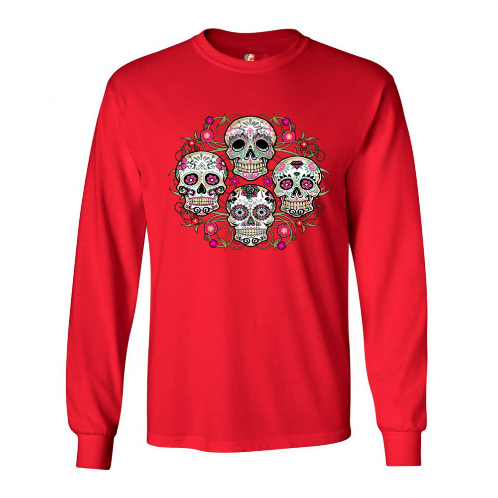 DAY OF THE DEAD FLORAL SUGAR SKULLS long sleeve t-shirt dia de los muertos red