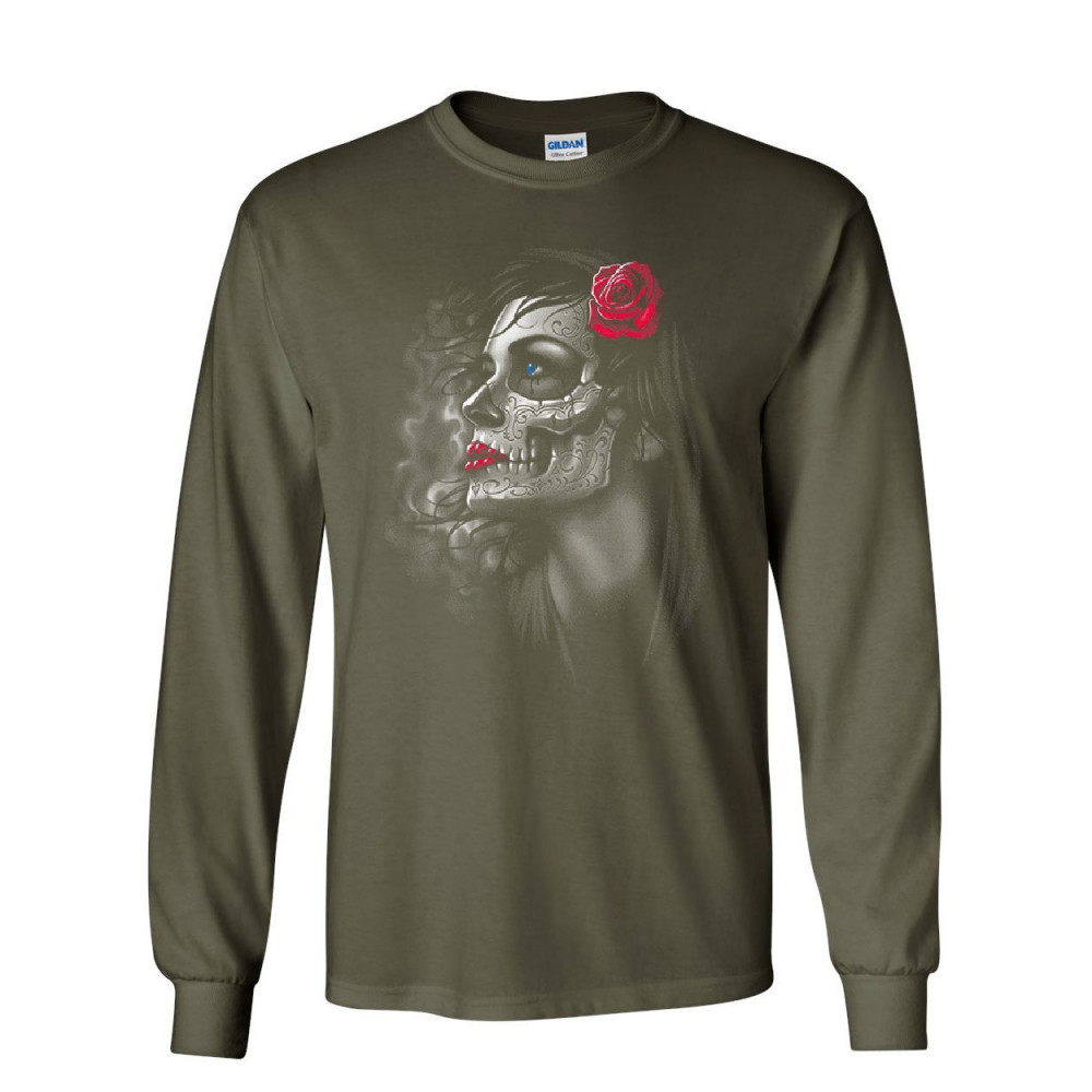 DAY OF THE DEAD GIRL long sleeve t-shirt skull face dia de los muertos roses tee military green