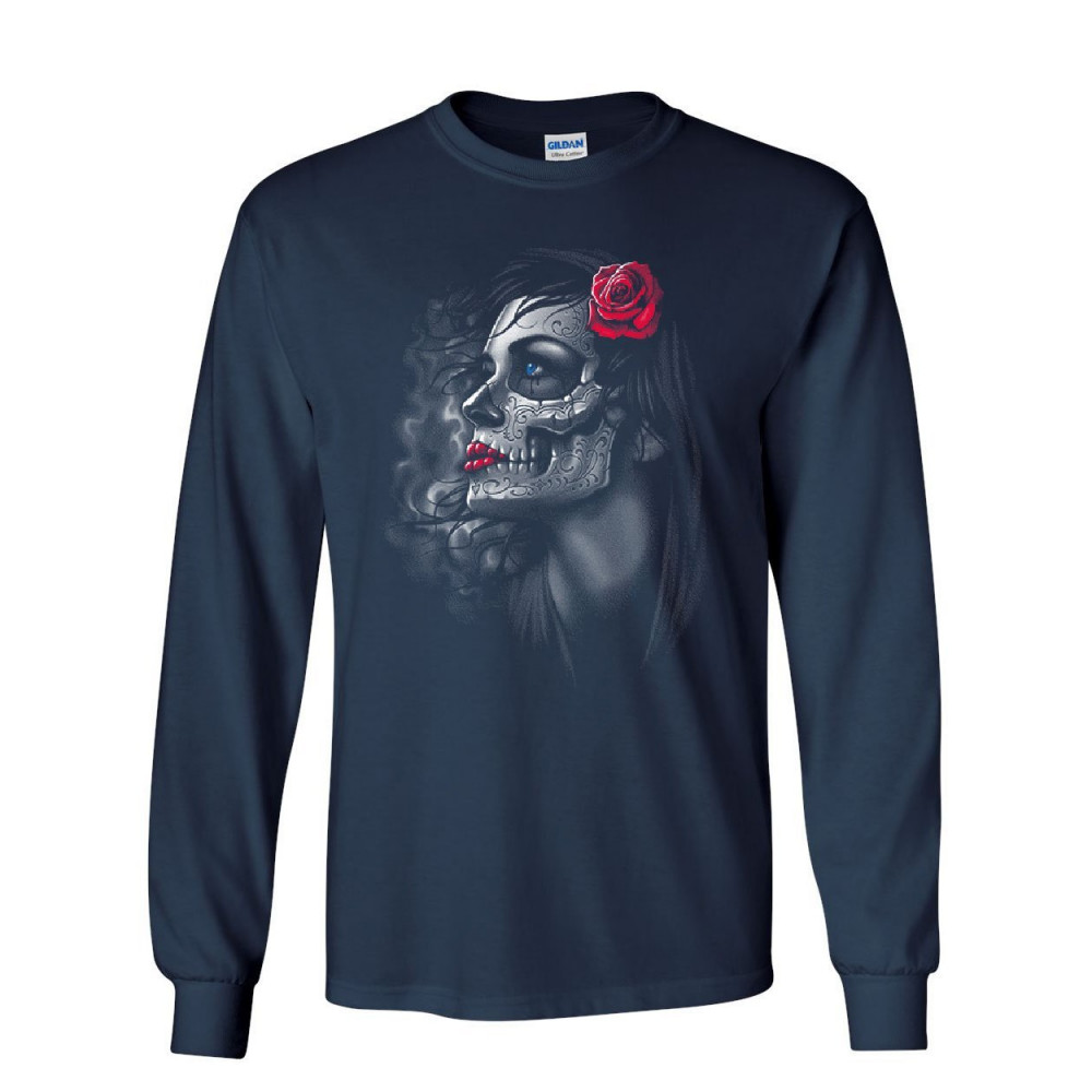 DAY OF THE DEAD GIRL long sleeve t-shirt skull face dia de los muertos roses tee navy blue