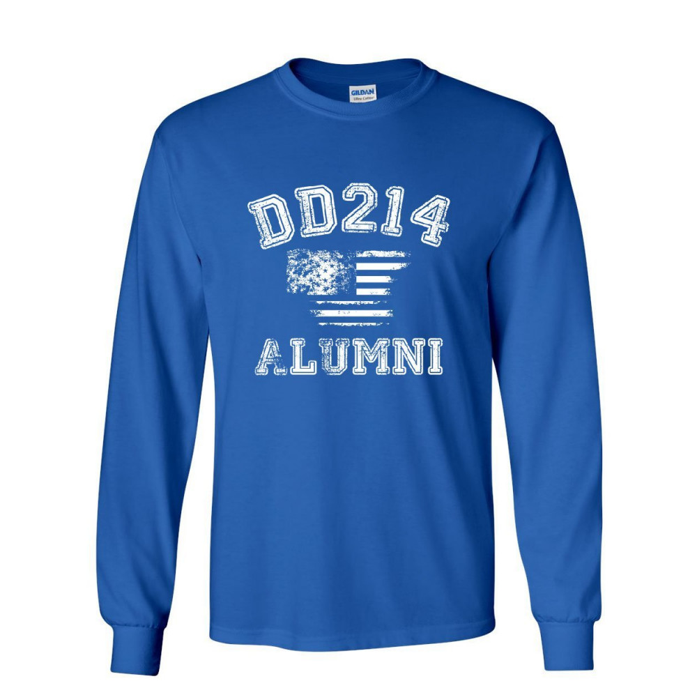 DD214 ALUMNI distressed american flag long sleeve t-shirt military veteran tee royal blue