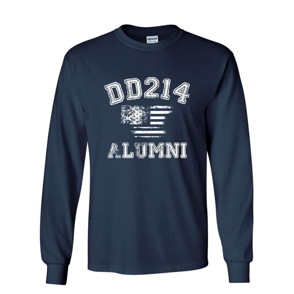 DD214 ALUMNI distressed american flag long sleeve t-shirt military veteran tee navy blue