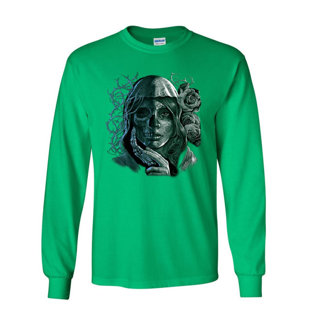 DEAD GIRL WITH ROSES long sleeve t-shirt sugar skull face day of the dead tee green