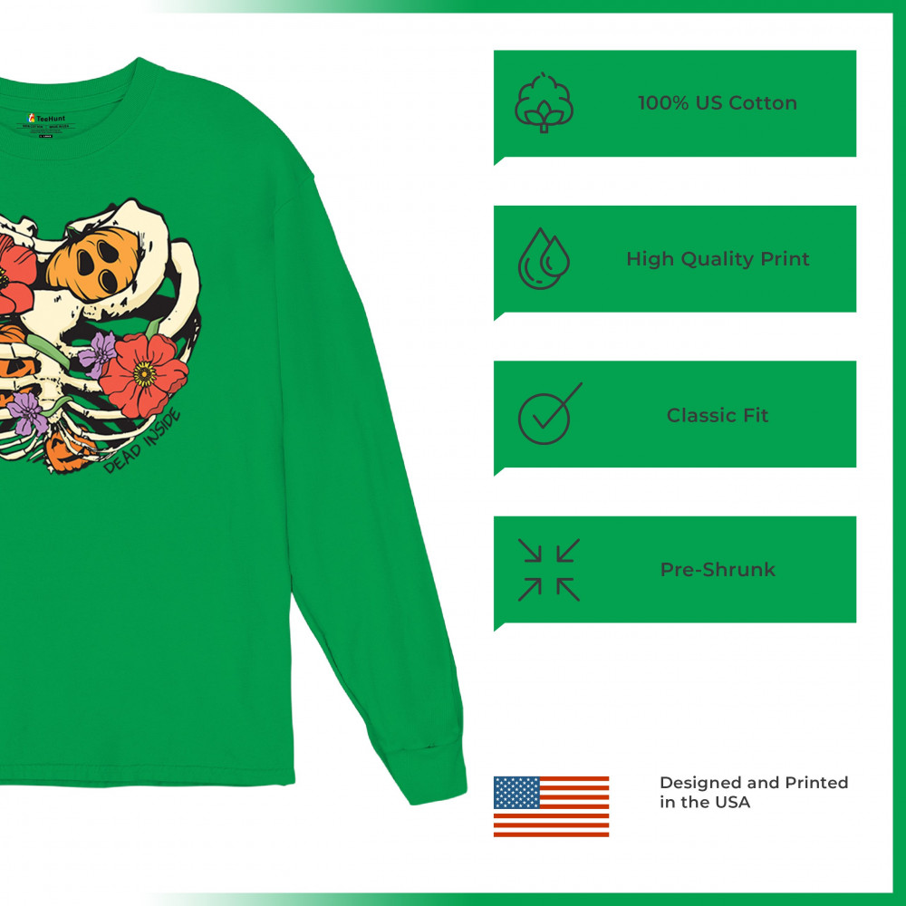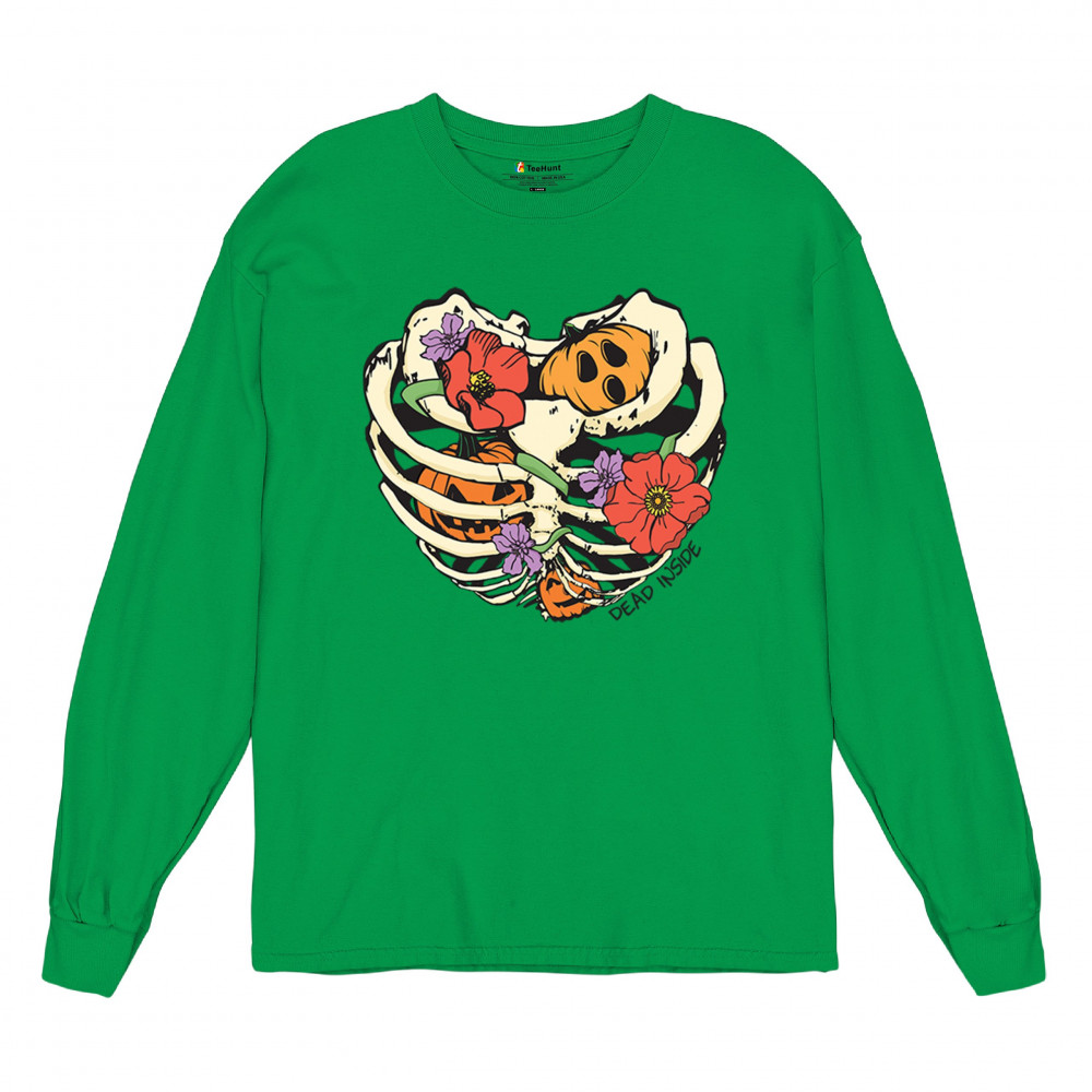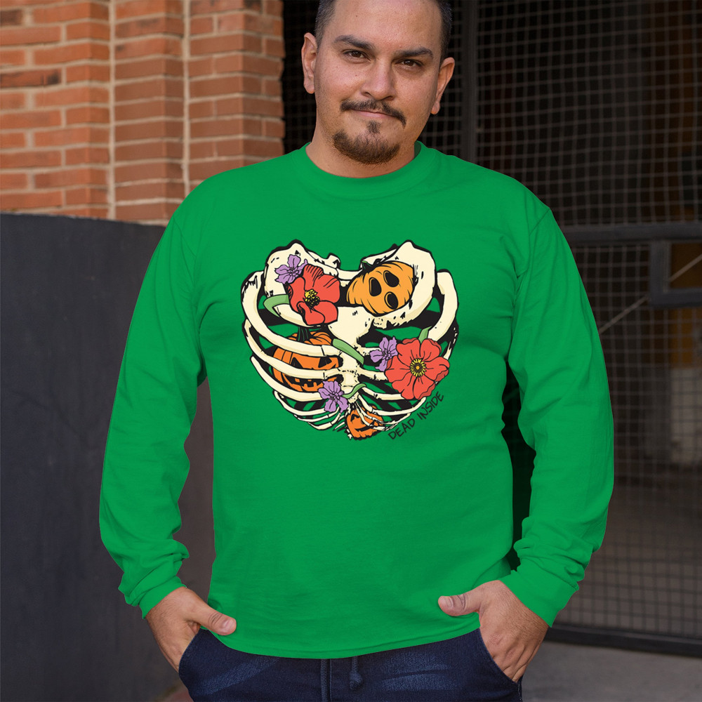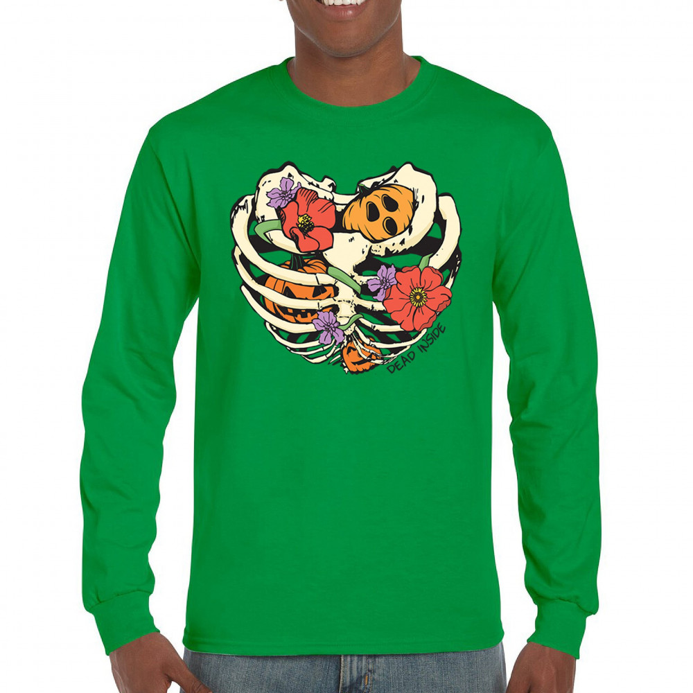 Celebrate Halloween with a quirky and cute design featuring a skeleton ribcage filled with pumpkins and flowers. Perfect for spooky season lovers!