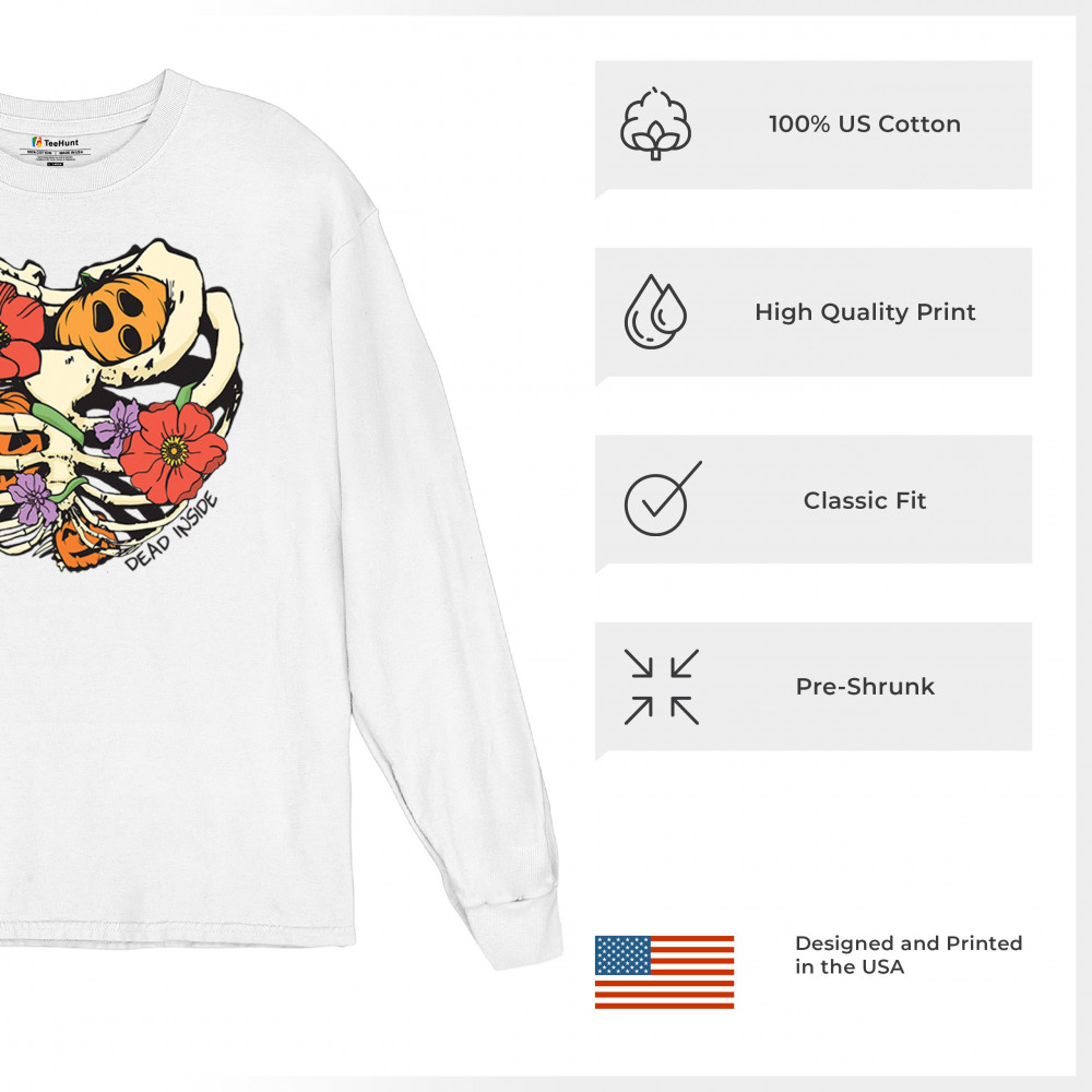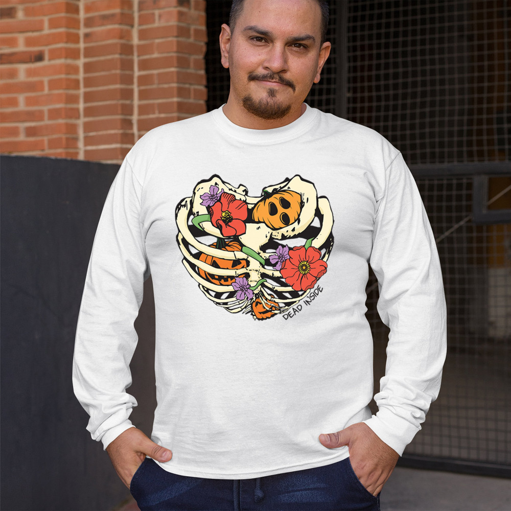 Celebrate Halloween with a quirky and cute design featuring a skeleton ribcage filled with pumpkins and flowers. Perfect for spooky season lovers!