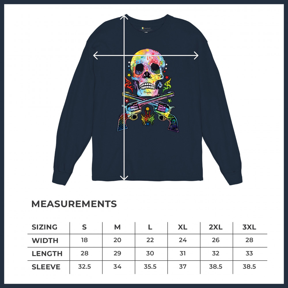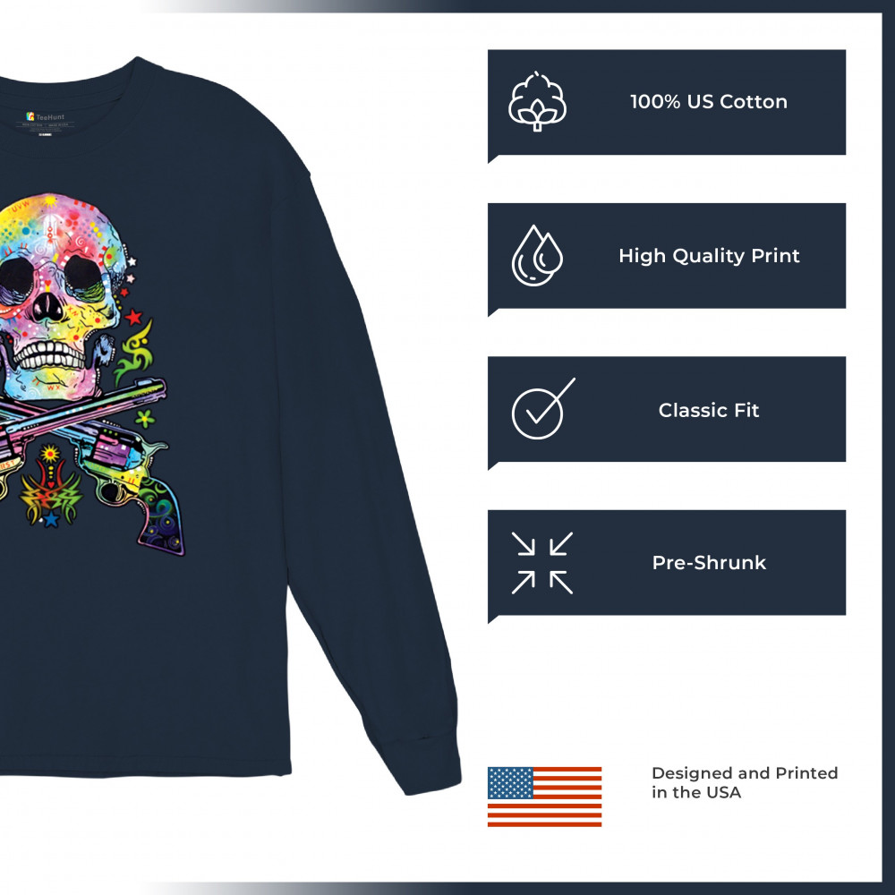DEAN RUSSO ART SKULL AND GUNS long sleeve t-shirt colorful 2nd amendment navy blue