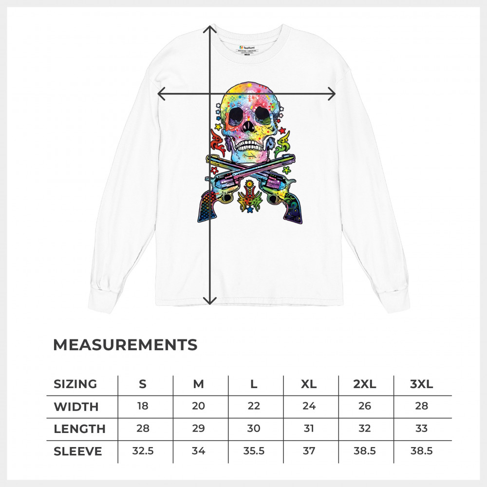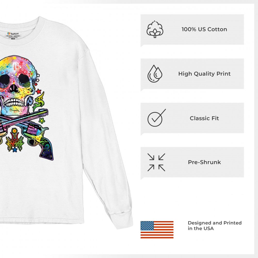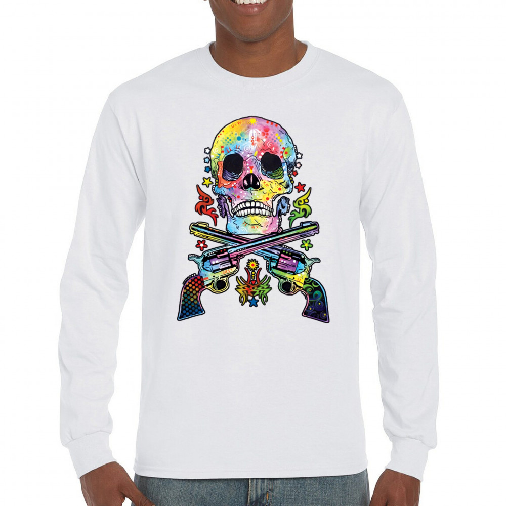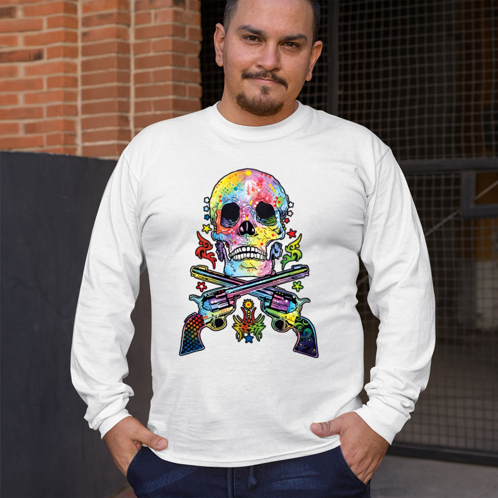 DEAN RUSSO ART SKULL AND GUNS long sleeve t-shirt colorful 2nd amendment white