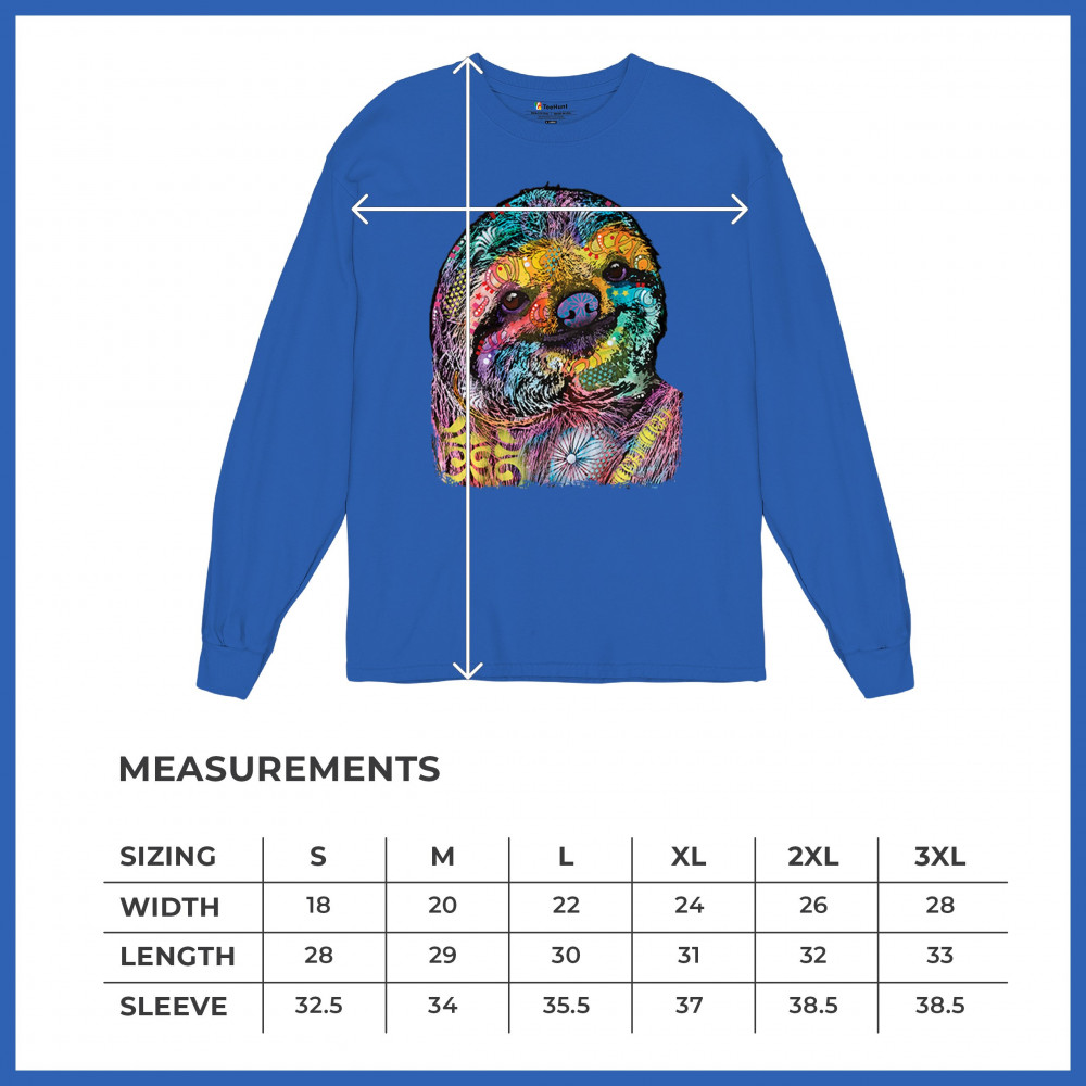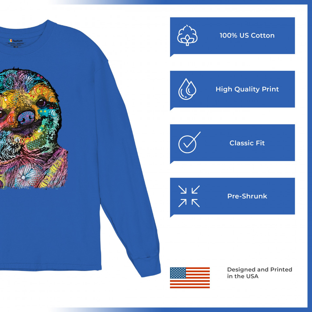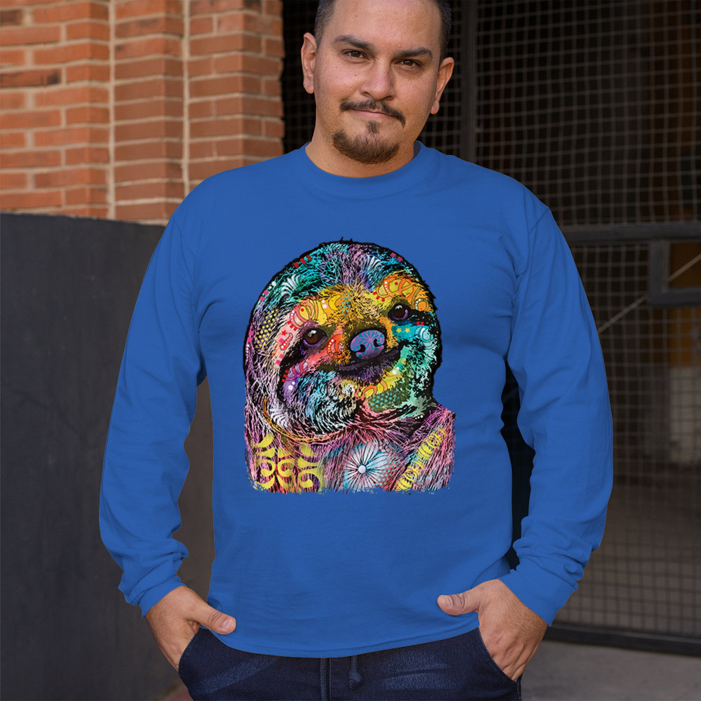 DEAN RUSSO CUTE LAZY SLOTH long sleeve t-shirt funny wild life colorful royal blue