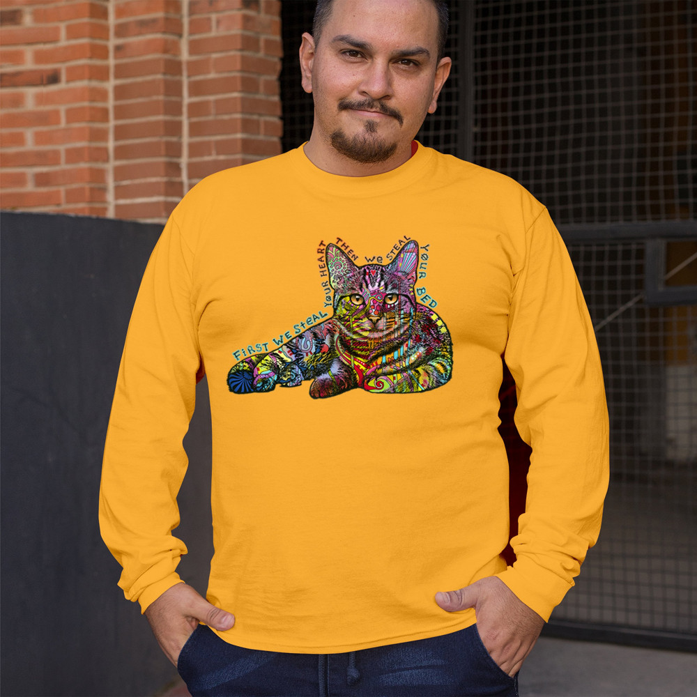 DEAN RUSSO CUTE NEON CAT long sleeve t-shirt first we steal your heart kitten yellow