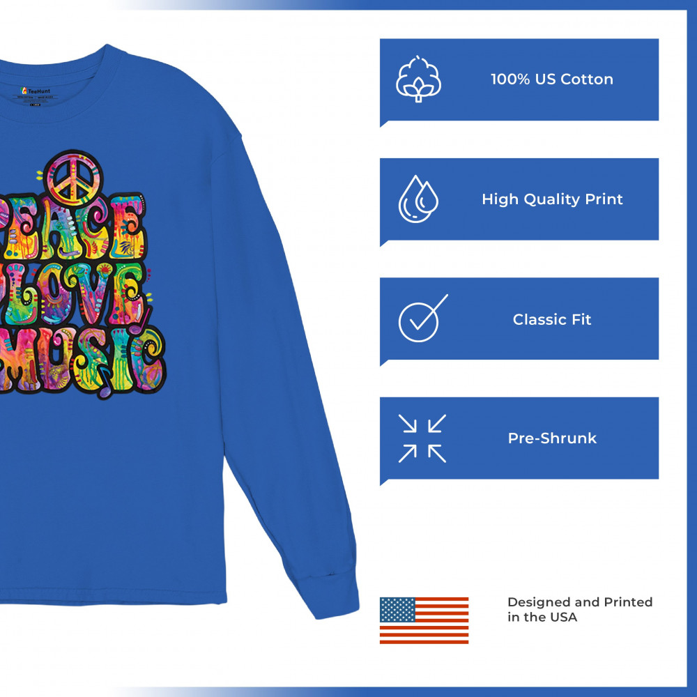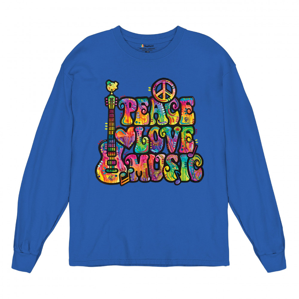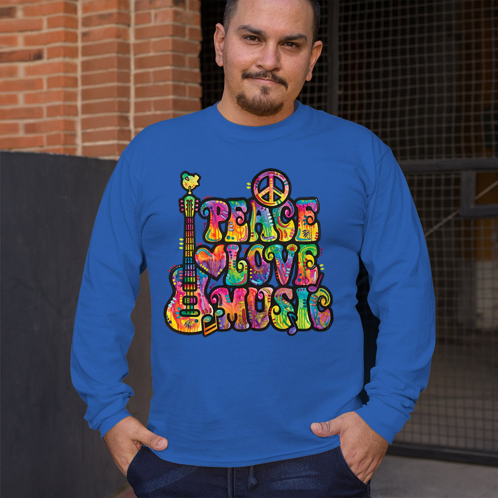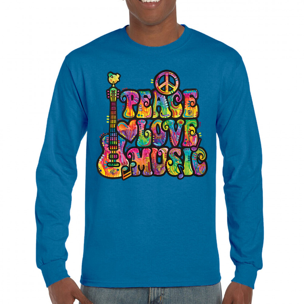 DEAN RUSSO PEACE LOVE MUSIC long sleeve t-shirt guitar happy good vibe royal blue