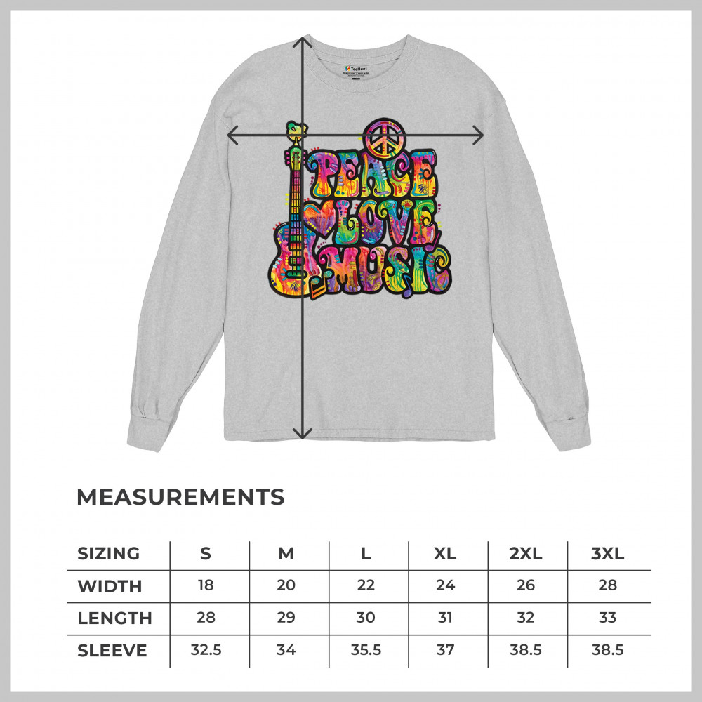 DEAN RUSSO PEACE LOVE MUSIC long sleeve t-shirt guitar happy good vibe gray