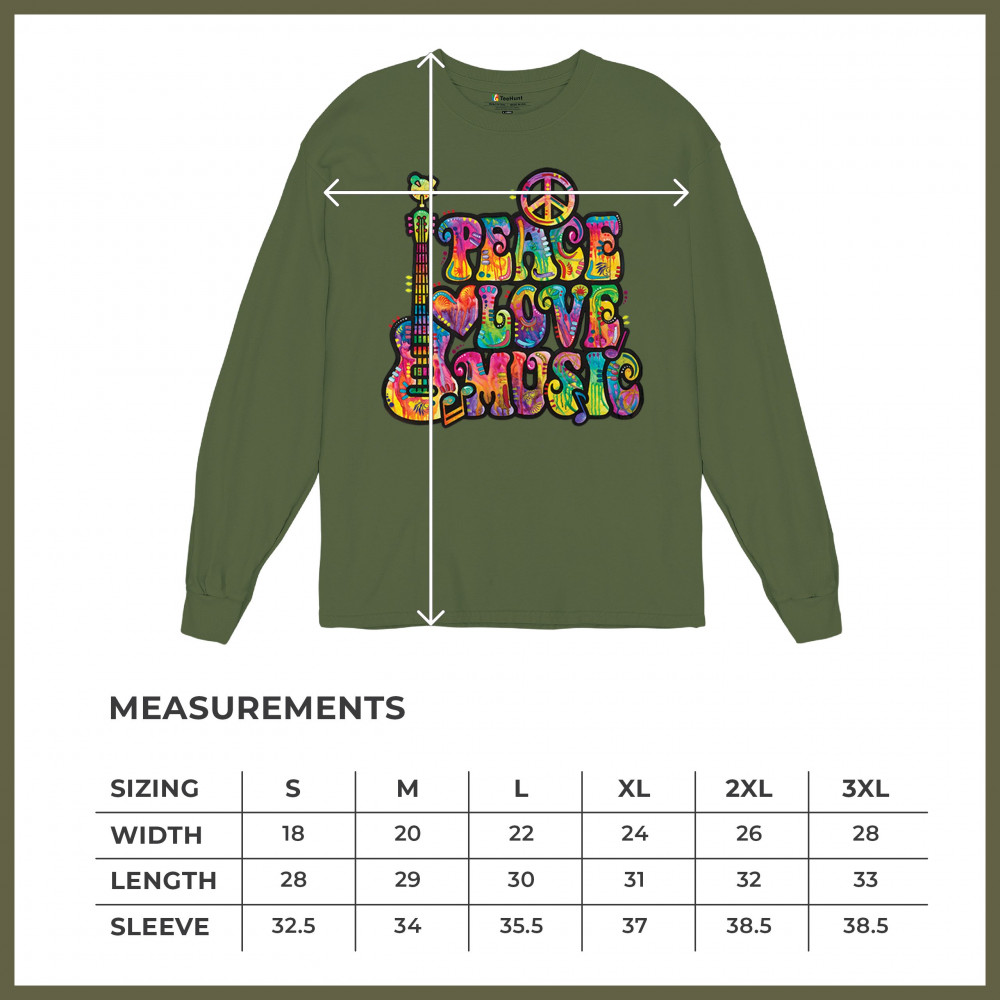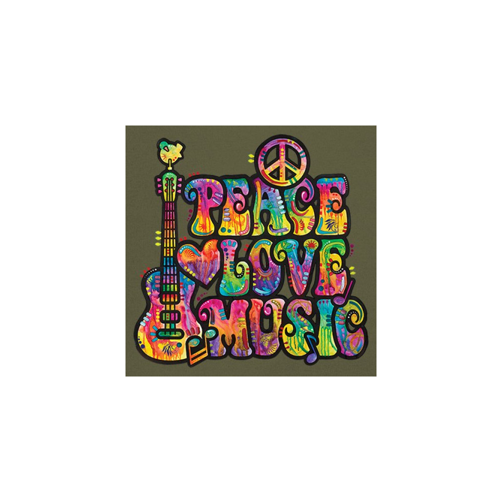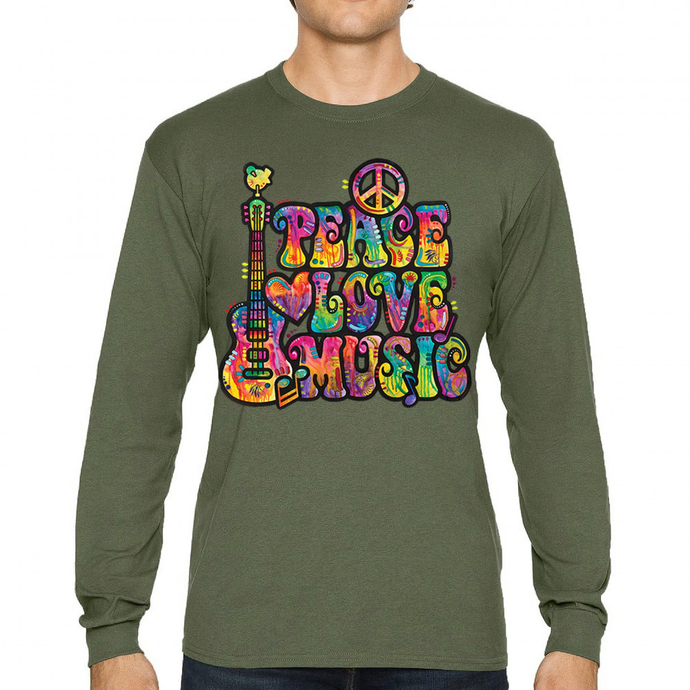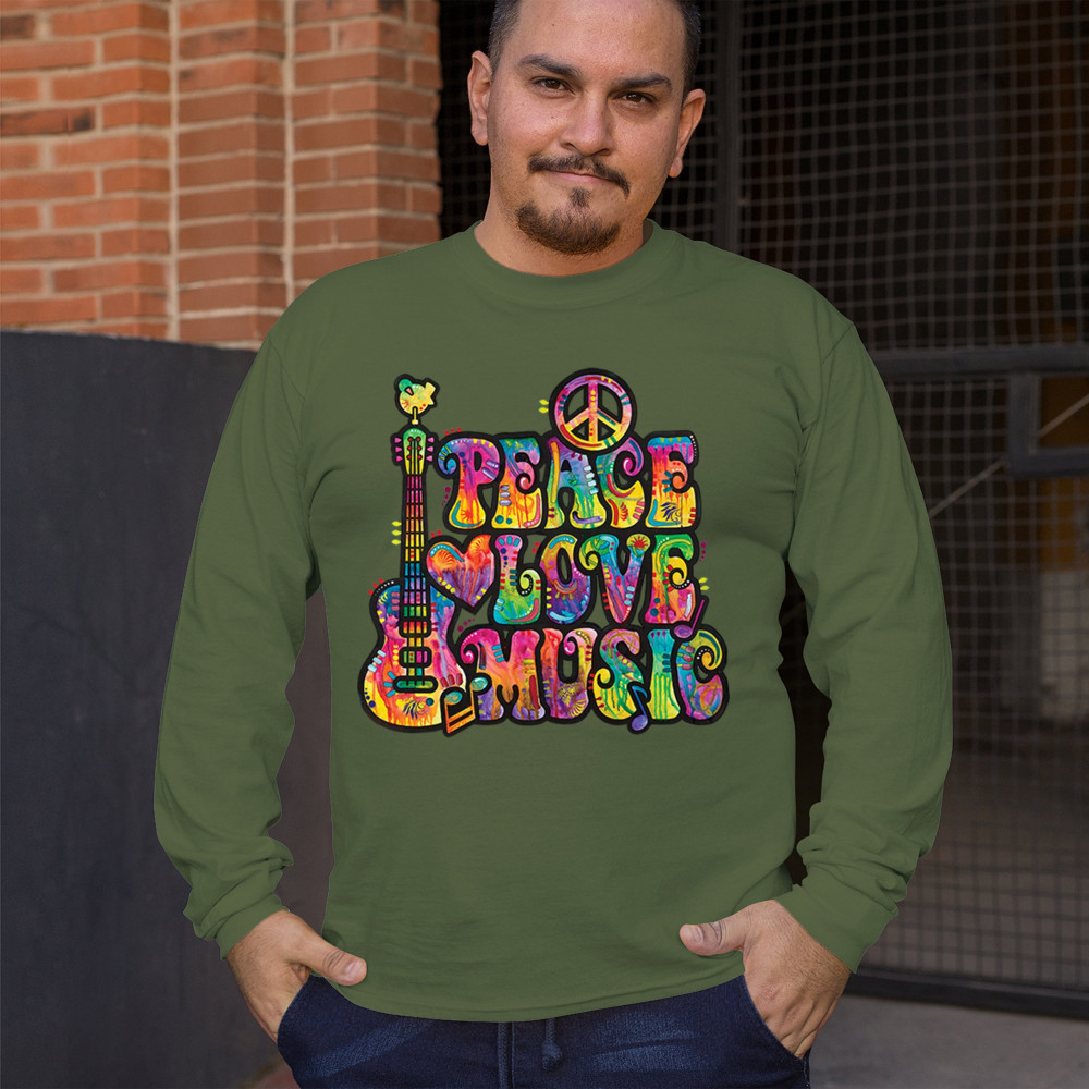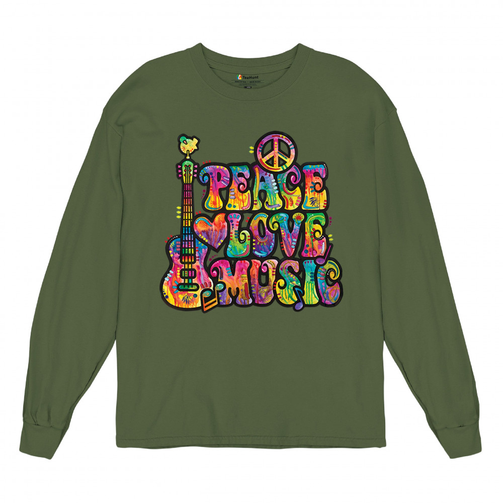 DEAN RUSSO PEACE LOVE MUSIC long sleeve t-shirt guitar happy good vibe military green