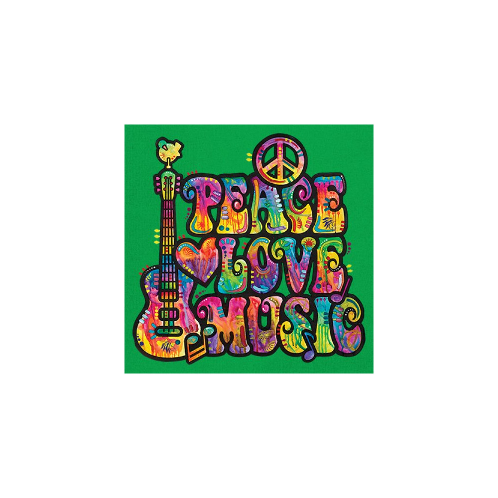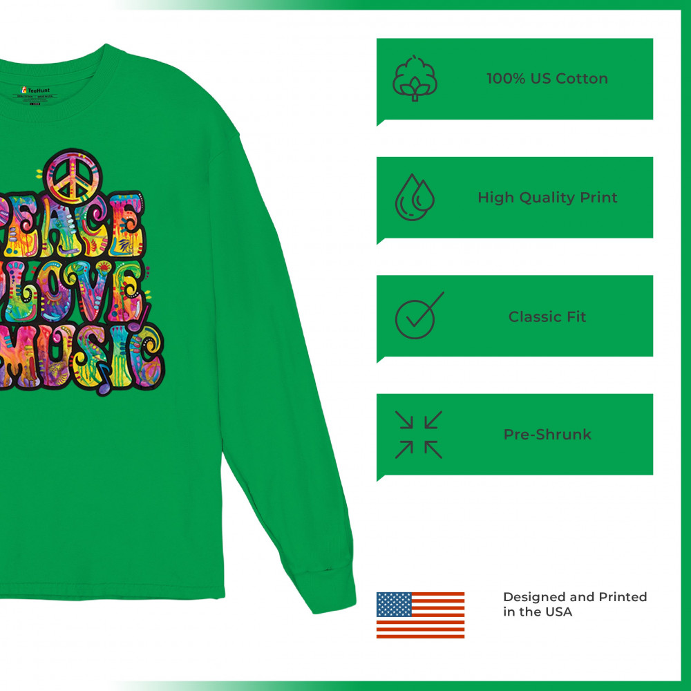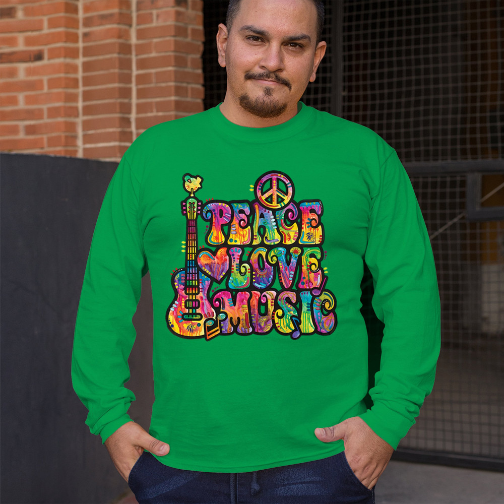 DEAN RUSSO PEACE LOVE MUSIC long sleeve t-shirt guitar happy good vibe green