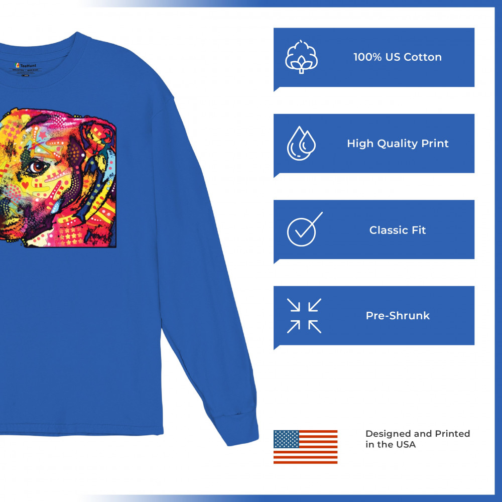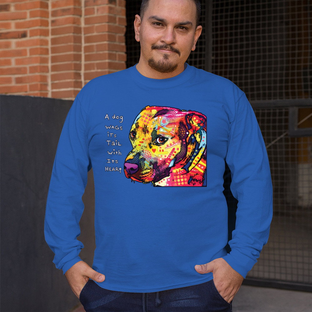 DEAN RUSSO PIT BULL long sleeve t-shirt dog wags its tail with its heart royal blue