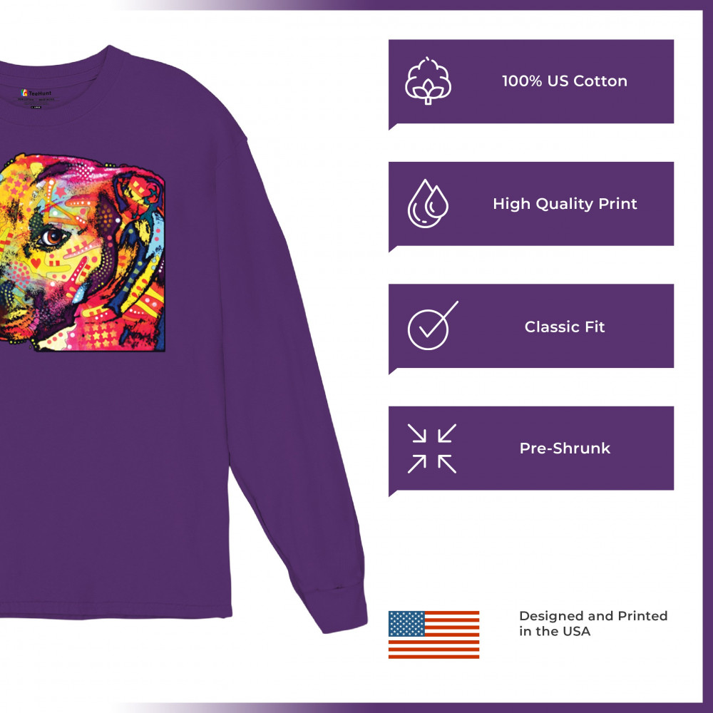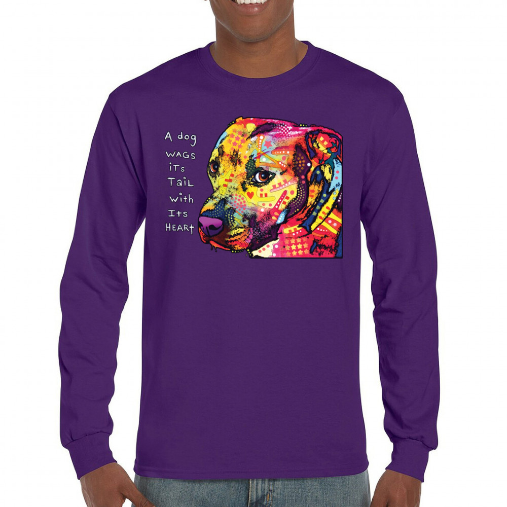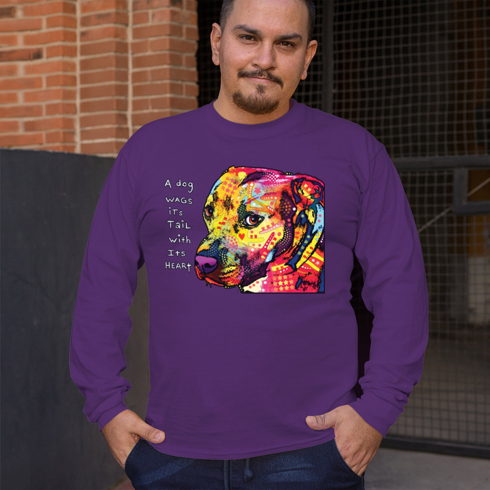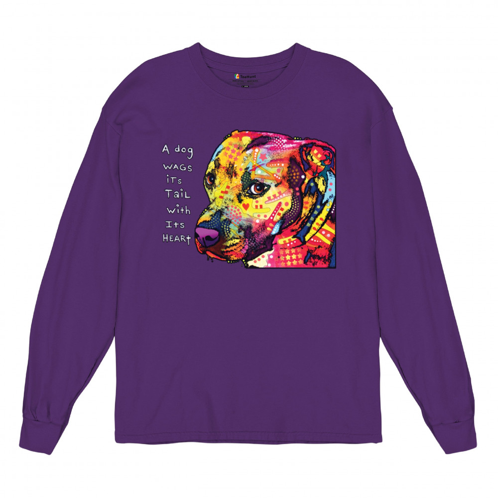 DEAN RUSSO PIT BULL long sleeve t-shirt dog wags its tail with its heart purple